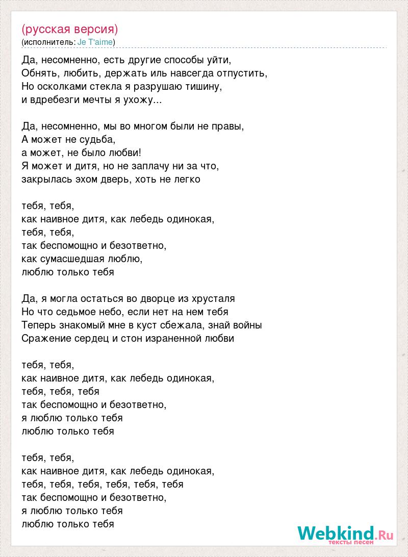 Да, несомненно, есть другие способы уйти, Обнять, любить, держать иль навсегда отпустить, Но осколками стекла я разрушаю тишину, и вдребезги мечты я ухожу... Да, несомненно, мы во многом были не правы, А может не судьба, а может, не было любви! Я может и дитя, но не заплачу ни за что, закрылась эхом дверь, хоть не легко тебя, тебя, как наивное дитя, как лебедь одинокая, тебя, тебя, так беспомощно и безответно, как сумасшедшая люблю, люблю только тебя Да, я могла остаться во дворце из хрусталя Но что седьмое небо, если нет на нем тебя Теперь знакомый мне в куст сбежала, знай войны Сражение сердец и стон израненной любви тебя, тебя, как наивное дитя, как лебедь одинокая, тебя, тебя, тебя так беспомощно и безответно, я люблю только тебя люблю только тебя тебя, тебя, как наивное дитя, как лебедь одинокая, тебя, тебя, тебя, тебя, тебя, тебя так беспомощно и безответно, я люблю только тебя люблю только тебя