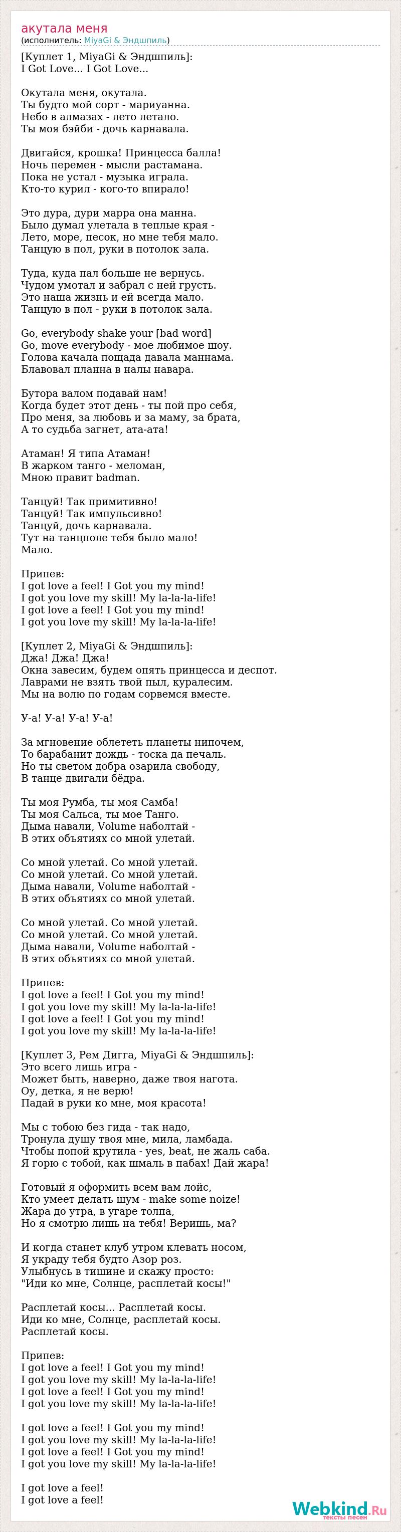 [Куплет 1, MiyaGi & Эндшпиль]: I Got Love... I Got Love... Окутала меня, окутала. Ты будто мой сорт - мариуанна. Небо в алмазах - лето летало. Ты моя бэйби - дочь карнавала. Двигайся, крошка! Принцесса балла! Ночь перемен - мысли растамана. Пока не устал - музыка играла. Кто-то курил - кого-то впирало! Это дура, дури марра она манна. Было думал улетала в теплые края - Лето, море, песок, но мне тебя мало. Танцую в пол, руки в потолок зала. Туда, куда пал больше не вернусь. Чудом умотал и забрал с ней грусть. Это наша жизнь и ей всегда мало. Танцую в пол - руки в потолок зала. Go, everybody shake your [bad word] Go, move everybody - мое любимое шоу. Голова качала пощада давала маннама. Блавовал планна в налы навара. Бутора валом подавай нам! Когда будет этот день - ты пой про себя, Про меня, за любовь и за маму, за брата, А то судьба загнет, ата-ата! Атаман! Я типа Атаман! В жарком танго - меломан, Мною правит badman. Танцуй! Так примитивно! Танцуй! Так импульсивно! Танцуй, дочь карнавала. Тут на танцполе тебя было мало! Мало. Припев: I got love a feel! I Got you my mind! I got you love my skill! My la-la-la-life! I got love a feel! I Got you my mind! I got you love my skill! My la-la-la-life! [Куплет 2, MiyaGi & Эндшпиль]: Джа! Джа! Джа! Окна завесим, будем опять принцесса и деспот. Лаврами не взять твой пыл, куралесим. Мы на волю по годам сорвемся вместе. У-а! У-а! У-а! У-а! За мгновение облететь планеты нипочем, То барабанит дождь - тоска да печаль. Но ты светом добра озарила свободу, В танце двигали бёдра. Ты моя Румба, ты моя Самба! Ты моя Сальса, ты мое Танго. Дыма навали, Volume наболтай - В этих объятиях со мной улетай. Со мной улетай. Со мной улетай. Со мной улетай. Со мной улетай. Дыма навали, Volume наболтай - В этих объятиях со мной улетай. Со мной улетай. Со мной улетай. Со мной улетай. Со мной улетай. Дыма навали, Volume наболтай - В этих объятиях со мной улетай. Припев: I got love a feel! I Got you my mind! I got you love my skill! My la-la-la-life! I got love a feel! I Got you my mind! I got you love my skill! My la-la-la-life! [Куплет 3, Рем Дигга, MiyaGi & Эндшпиль]: Это всего лишь игра - Может быть, наверно, даже твоя нагота. Оу, детка, я не верю! Падай в руки ко мне, моя красота! Мы с тобою без гида - так надо, Тронула душу твоя мне, мила, ламбада. Чтобы попой крутила - yes, beat, не жаль саба. Я горю с тобой, как шмаль в пабах! Дай жара! Готовый я оформить всем вам лойс, Кто умеет делать шум - make some noize! Жара до утра, в угаре толпа, Но я смотрю лишь на тебя! Веришь, ма? И когда станет клуб утром клевать носом, Я украду тебя будто Азор роз. Улыбнусь в тишине и скажу просто: "Иди ко мне, Солнце, расплетай косы!" Расплетай косы... Расплетай косы. Иди ко мне, Солнце, расплетай косы. Расплетай косы. Припев: I got love a feel! I Got you my mind! I got you love my skill! My la-la-la-life! I got love a feel! I Got you my mind! I got you love my skill! My la-la-la-life! I got love a feel! I Got you my mind! I got you love my skill! My la-la-la-life! I got love a feel! I Got you my mind! I got you love my skill! My la-la-la-life! I got love a feel! I got love a feel!