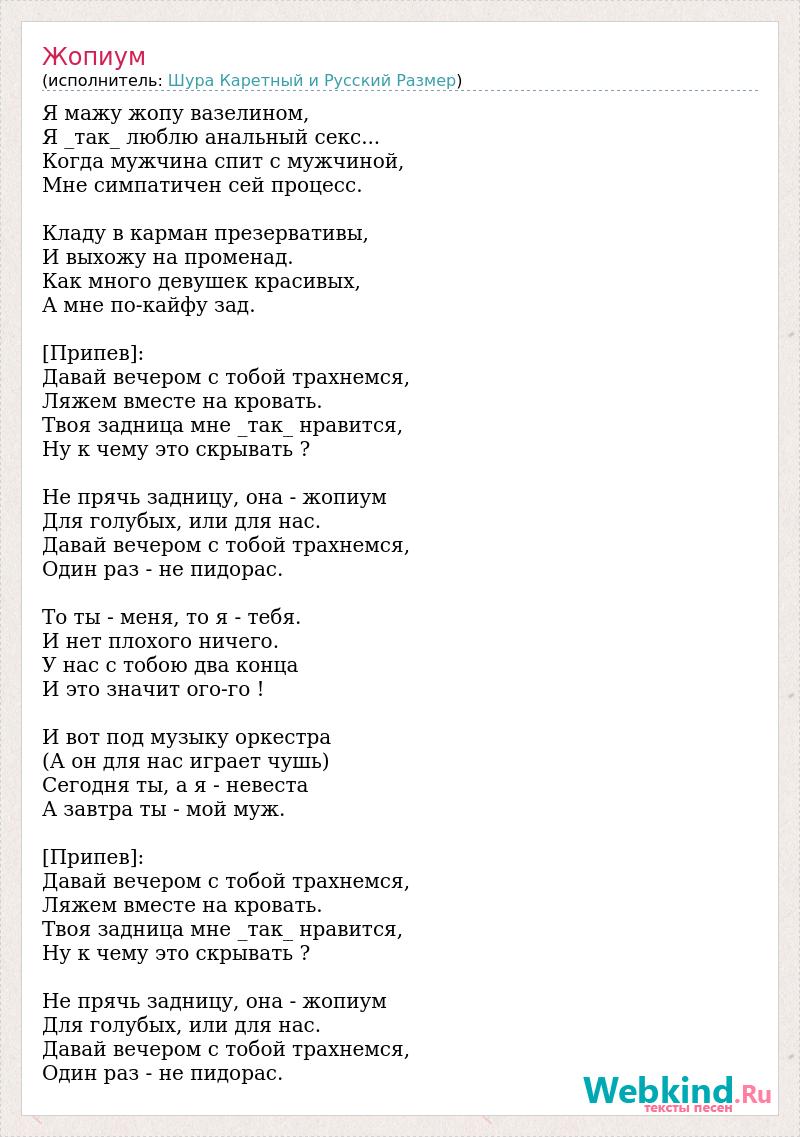Я мажу жопу вазелином, Я _так_ люблю анальный секс... Когда мужчина спит с мужчиной, Мне симпатичен сей процесс. Кладу в карман презервативы, И выхожу на променад. Как много девушек красивых, А мне по-кайфу зад. [Припев]: Давай вечером с тобой трахнемся, Ляжем вместе на кровать. Твоя задница мне _так_ нравится, Hу к чему это скрывать ? Hе прячь задницу, она - жопиум Для голубых, или для нас. Давай вечером с тобой трахнемся, Один раз - не пидорас. То ты - меня, то я - тебя. И нет плохого ничего. У нас с тобою два конца И это значит ого-го ! И вот под музыку оркестра (А он для нас играет чушь) Сегодня ты, а я - невеста А завтра ты - мой муж. [Припев]: Давай вечером с тобой трахнемся, Ляжем вместе на кровать. Твоя задница мне _так_ нравится, Hу к чему это скрывать ? Hе прячь задницу, она - жопиум Для голубых, или для нас. Давай вечером с тобой трахнемся, Один раз - не пидорас.