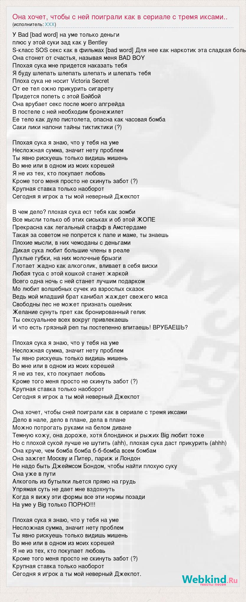 У Bad [bad word] на уме только деньги плюс у этой суки зад как у Bentley S-класс SOS секс как в фильмах [bad word] Для нее как наркотик эта сладкая боль Она стонет от счастья, называя меня BAD BOY Плохая сука мне придется наказать тебя Я буду шлепать шлепать шлепать и шлепать тебя Плоха сука не носит Victoria Secret От ее тел ожно прикурить сигарету Придется попеть с этой Бэйбой Она врубает секс после моего апгрейда В постеле с ней необходим бронежилет Ее тело как дуло пистолета, опасна как часовая бомба Саки лики напони тайны тиктиктики (?) Плохая сука я знаю, что у тебя на уме Несложная сумма, значит нету проблем Ты явно рискуешь только видишь мишень Во мне или в одном из моих корешей Я не из тех, кто покупает любовь Кроме того меня просто не скинуть забот (?) Крупная ставка только наоборот Сегодня я игрок а ты мой неверный Джекпот В чем дело? плохая сука ест тебя как зомби Все мысли только об этих сиськах и об этой ЖОПЕ Прекрасна как легальный стафф в Амстердаме Такая за советом не попрется к папе и маме, ты знаешь Плохие мысли, в них чемоданы с деньгами Дикая сука любит большие члены в реале Пухлые губки, на них молочные брызги Глотает жадно как алкоголик, вливает в себя виски Любая туса с этой кошкой станет жаркой Всего одна ночь с ней станет лучшим подарком Мо любит волшебных сучек из взрослых сказок Ведь мой младший брат канибал жаждет свежего мяса Свободны пес не может признать ошейник Желание сунуть прет как бронированный гелик Ты сексуальнее всех вокруг привлекаешь И что есть грязный реп ты постепенно впитаешь! ВРУБАЕШЬ? Плохая сука я знаю, что у тебя на уме Несложная сумма, значит нету проблем Ты явно рискуешь только видишь мишень Во мне или в одном из моих корешей Я не из тех, кто покупает любовь Кроме того меня просто не скинуть забот (?) Крупная ставка только наоборот Сегодня я игрок а ты мой неверный Джекпот Она хочет, чтобы сней поиграли как в сериале с тремя иксами Дело в нале, дело в плане, дела в плане Можно потрогать руками на белом диване Темную кожу, она дороже, хотя блондинок и рыжих Big любит тоже Но с плохой сукой лучше не шутить (ahh), плохая сука даст прикурить (ahhh) Она круче, чем бомба бомба б-б-бомба всем бомбам Она зажгет Москву и Питер, париж и Лондон Не надо быть Джеймсом Бондом, чтобы найти плохую суку Она уже в пути Алкоголь из бутылки льется прямо на грудь Упрямая суть не дает мне вздохнуть Когда я вижу эти формы все эти нормы позади На уме у Big только ПОРНО!!! Плохая сука я знаю, что у тебя на уме Несложная сумма, значит нету проблем Ты явно рискуешь только видишь мишень Во мне или в одном из моих корешей Я не из тех, кто покупает любовь Кроме того меня просто не скинуть забот (?) Крупная ставка только наоборот Сегодня я игрок а ты мой неверный Джекпот.