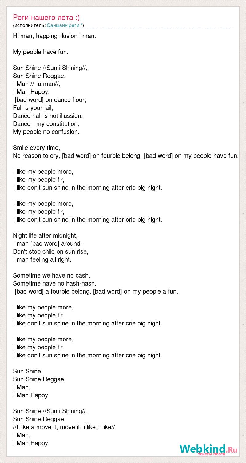 Hi man, happing illusion i man. My people have fun. Sun Shine //Sun i Shining//, Sun Shine Reggae, I Man //I a man//, I Man Happy. [bad word] on dance floor, Full is your jail, Dance hall is not illussion, Dance - my constitution, My people no confusion. Smile every time, No reason to cry, [bad word] on fourble belong, [bad word] on my people have fun. I like my people more, I like my people fir, I like don't sun shine in the morning after crie big night. I like my people more, I like my people fir, I like don't sun shine in the morning after crie big night. Night life after midnight, I man [bad word] around. Don't stop child on sun rise, I man feeling all right. Sometime we have no cash, Sometime have no hash-hash, [bad word] a fourble belong, [bad word] on my people a fun. I like my people more, I like my people fir, I like don't sun shine in the morning after crie big night. I like my people more, I like my people fir, I like don't sun shine in the morning after crie big night. Sun Shine, Sun Shine Reggae, I Man, I Man Happy. Sun Shine //Sun i Shining//, Sun Shine Reggae, //I like a move it, move it, i like, i like// I Man, I Man Happy.