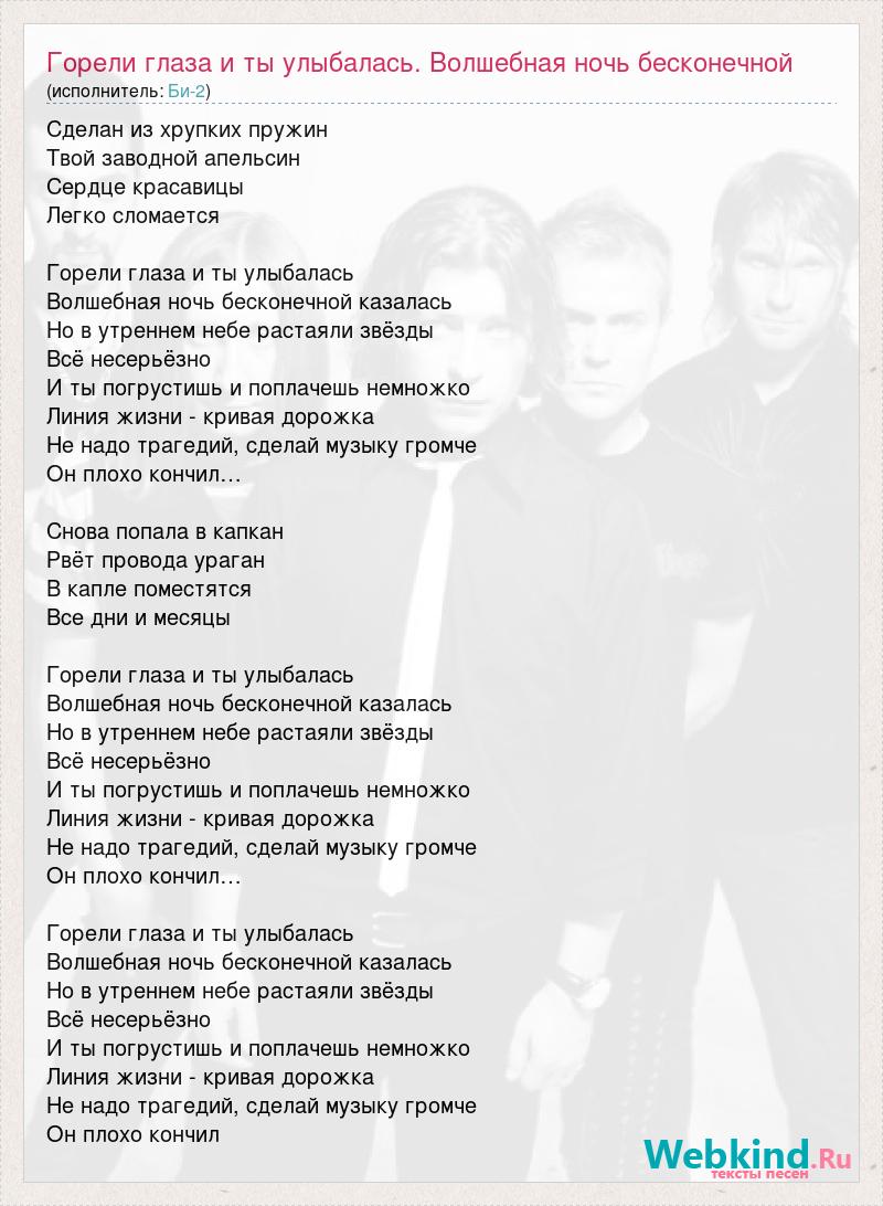 Сделан из хрупких пружин Твой заводной апельсин Сердце красавицы Легко сломается Горели глаза и ты улыбалась Волшебная ночь бесконечной казалась Но в утреннем небе растаяли звёзды Всё несерьёзно И ты погрустишь и поплачешь немножко Линия жизни - кривая дорожка Не надо трагедий, сделай музыку громче Он плохо кончил… Снова попала в капкан Рвёт провода ураган В капле поместятся Все дни и месяцы Горели глаза и ты улыбалась Волшебная ночь бесконечной казалась Но в утреннем небе растаяли звёзды Всё несерьёзно И ты погрустишь и поплачешь немножко Линия жизни - кривая дорожка Не надо трагедий, сделай музыку громче Он плохо кончил… Горели глаза и ты улыбалась Волшебная ночь бесконечной казалась Но в утреннем небе растаяли звёзды Всё несерьёзно И ты погрустишь и поплачешь немножко Линия жизни - кривая дорожка Не надо трагедий, сделай музыку громче Он плохо кончил