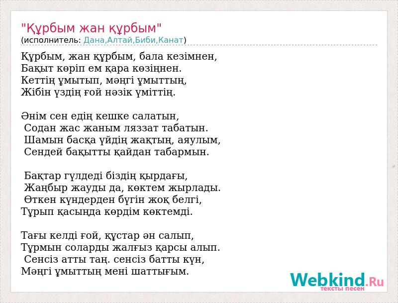 Құрбым, жан құрбым, бала кезімнен, Бақыт көріп ем қара көзіңнен. Кеттің ұмытып, мәңгі ұмыттың, Жібін үздің ғой нәзік үміттің. Әнім сен едің кешке салатын, Содан жас жаным ляззат табатын. Шамын басқа үйдің жақтың, аяулым, Сендей бақытты қайдан табармын. Бақтар гүлдеді біздің қырдағы, Жаңбыр жауды да, көктем жырлады. Өткен күндерден бүгін жоқ белгі, Тұрып қасыңда көрдім көктемді. Тағы келді ғой, құстар ән салып, Тұрмын соларды жалғыз қарсы алып. Сенсіз атты таң. сенсіз батты күн, Мәңгі ұмыттың мені шаттығым.