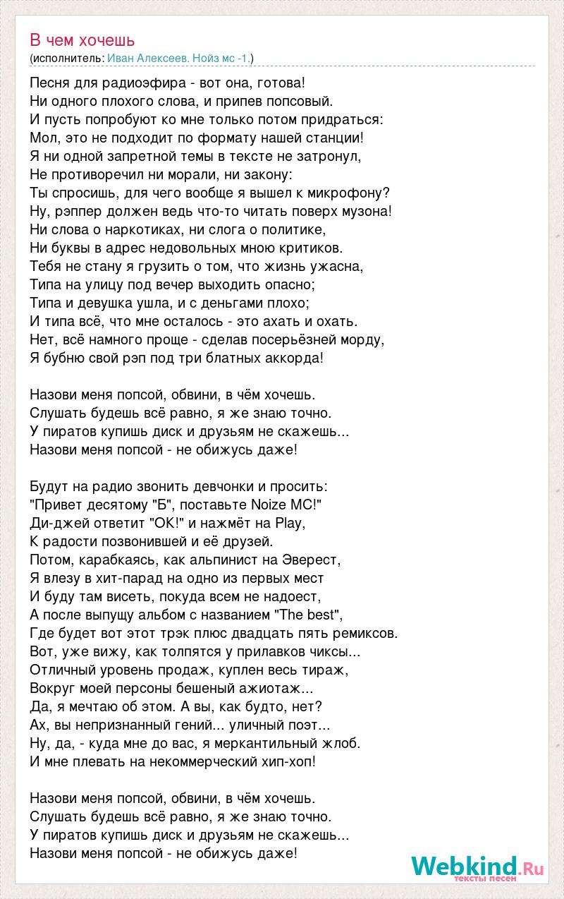 Песня для радиоэфира - вот она, готова! Ни одного плохого слова, и припев попсовый. И пусть попробуют ко мне только потом придраться: Мол, это не подходит по формату нашей станции! Я ни одной запретной темы в тексте не затронул, Не противоречил ни морали, ни закону: Ты спросишь, для чего вообще я вышел к микрофону? Ну, рэппер должен ведь что-то читать поверх музона! Ни слова о наркотиках, ни слога о политике, Ни буквы в адрес недовольных мною критиков. Тебя не стану я грузить о том, что жизнь ужасна, Типа на улицу под вечер выходить опасно; Типа и девушка ушла, и с деньгами плохо; И типа всё, что мне осталось - это ахать и охать. Нет, всё намного проще - сделав посерьёзней морду, Я бубню свой рэп под три блатных аккорда! Назови меня попсой, обвини, в чём хочешь. Слушать будешь всё равно, я же знаю точно. У пиратов купишь диск и друзьям не скажешь... Назови меня попсой - не обижусь даже! Будут на радио звонить девчонки и просить: "Привет десятому "Б", поставьте Noize MC!" Ди-джей ответит "ОК!" и нажмёт на Play, К радости позвонившей и её друзей. Потом, карабкаясь, как альпинист на Эверест, Я влезу в хит-парад на одно из первых мест И буду там висеть, покуда всем не надоест, А после выпущу альбом с названием "The best", Где будет вот этот трэк плюс двадцать пять ремиксов. Вот, уже вижу, как толпятся у прилавков чиксы... Отличный уровень продаж, куплен весь тираж, Вокруг моей персоны бешеный ажиотаж... Да, я мечтаю об этом. А вы, как будто, нет? Ах, вы непризнанный гений... уличный поэт... Ну, да, - куда мне до вас, я меркантильный жлоб. И мне плевать на некоммерческий хип-хоп! Назови меня попсой, обвини, в чём хочешь. Слушать будешь всё равно, я же знаю точно. У пиратов купишь диск и друзьям не скажешь... Назови меня попсой - не обижусь даже!