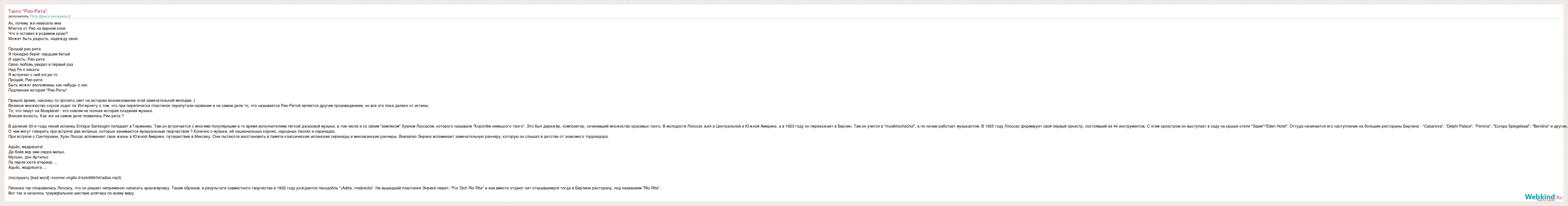 Ах, почему же невесело мне Мчатся от Рио на верном коне Что я оставил в родимом краю? Может быть радость, надежду свою Прощай рио рита Я покидаю берег сердцем битый И здесть, Рио-рита Свою любовь увидел в первый раз Над Ри о закаты Я встречал с ней когда-то Прощай, Рио-рита Быть может васпомнишь как-нибудь о нас Подлинная история "Рио-Риты" Пришло время, наконец-то пролить свет на историю возникновения этой замечательной мелодии :) Великое множество слухов ходит по Интернету о том, что при перепечатке пластинок перепутали название и на самом деле то, что называется Рио-Ритой является другим произведением, но все это пока далеко от истины. То, что пишут на Musplanet - это совсем не полная история создания музыки. Внесем ясность. Как же на самом деле появилась Рио-рита ? В далекие 30-е годы некий испанец Enrique Santeugini попадает в Германию. Там он встречается с многими популярными в то время исполнителями легкой джазовой музыки, в том числе и со своим "земляком" Хуаном Лоссасом, которого называли "Королём немецкого танго". Это был дирижёр, композитор, сочинивший множество красивых танго. В молодости Ллоссас жил в Центральной и Южной Америке, а в 1923 году он переезжает в Берлин. Там он учится в "musikhochschul", а по ночам работает музыкантом. В 1925 году Ллоссас формирует свой первый оркестр, состоявший из 44 инструментов. С этим оркестром он выступает в саду на крыше отеля "Эдем"/"Eden Hotel". Оттуда начинается его наступление на большие рестораны Берлина - "Casanova", "Delphi Palace", "Femina", "Europa Spiegelsaal", "Berolina" и другие. О чем могут говорить при встрече два испанца, которые занимаются музыкальным творчеством ? Конечно о музыке, её национальных корнях, народных песнях и серенадах. При встрече с Сантеухини, Хуан Лоссас вспоминает свое жизнь в Южной Америке, путешествие в Мексику. Они пытаются восстановить в памяти классические испанские серенады и мексиканские ранчеры. Внезапно Энрике вспоминает замечательную ранчеру, которую он слышал в детстве от знакомого торреадора. Адьёс, мадресита! Де бойя вер ами серра мильо. Мусьен, дон Артильо Ла перле кюте етериор ... Адьёс, мадресита ... (послушать [bad word] /xoomer.virgilio.it/solo999/hit/adios.mp3) Песенка так понравилась Лоссасу, что он решает непременно написать аранжировку. Таким образом, в результате совместного творчества в 1932 году рождается пасодобль "¡Adiós, madrecita". На вышедшей пластинке Энрике пишет: "Fur Dich Rio Rita" и они вместе отдают хит открывшемуся тогда в Берлине ресторану, под названием "Rio Rita". Вот так и началось триумфальное шествие шлягера по всему миру.