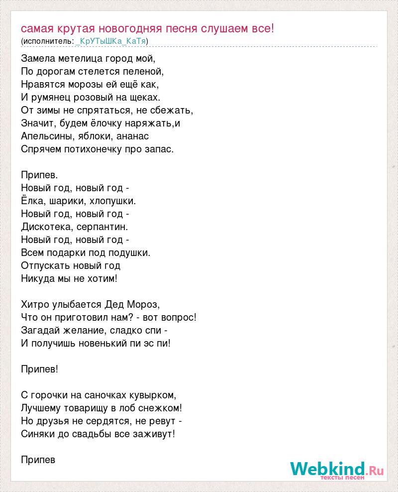 Замела метелица город мой, По дорогам стелется пеленой, Нравятся морозы ей ещё как, И румянец розовый на щеках. От зимы не спрятаться, не сбежать, Значит, будем ёлочку наряжать,и Апельсины, яблоки, ананас Спрячем потихонечку про запас. Припев. Новый год, новый год - Ёлка, шарики, хлопушки. Новый год, новый год - Дискотека, серпантин. Новый год, новый год - Всем подарки под подушки. Отпускать новый год Никуда мы не хотим! Хитро улыбается Дед Мороз, Что он приготовил нам? - вот вопрос! Загадай желание, сладко спи - И получишь новенький пи эс пи! Припев! С горочки на саночках кувырком, Лучшему товарищу в лоб снежком! Но друзья не сердятся, не ревут - Синяки до свадьбы все заживут! Припев