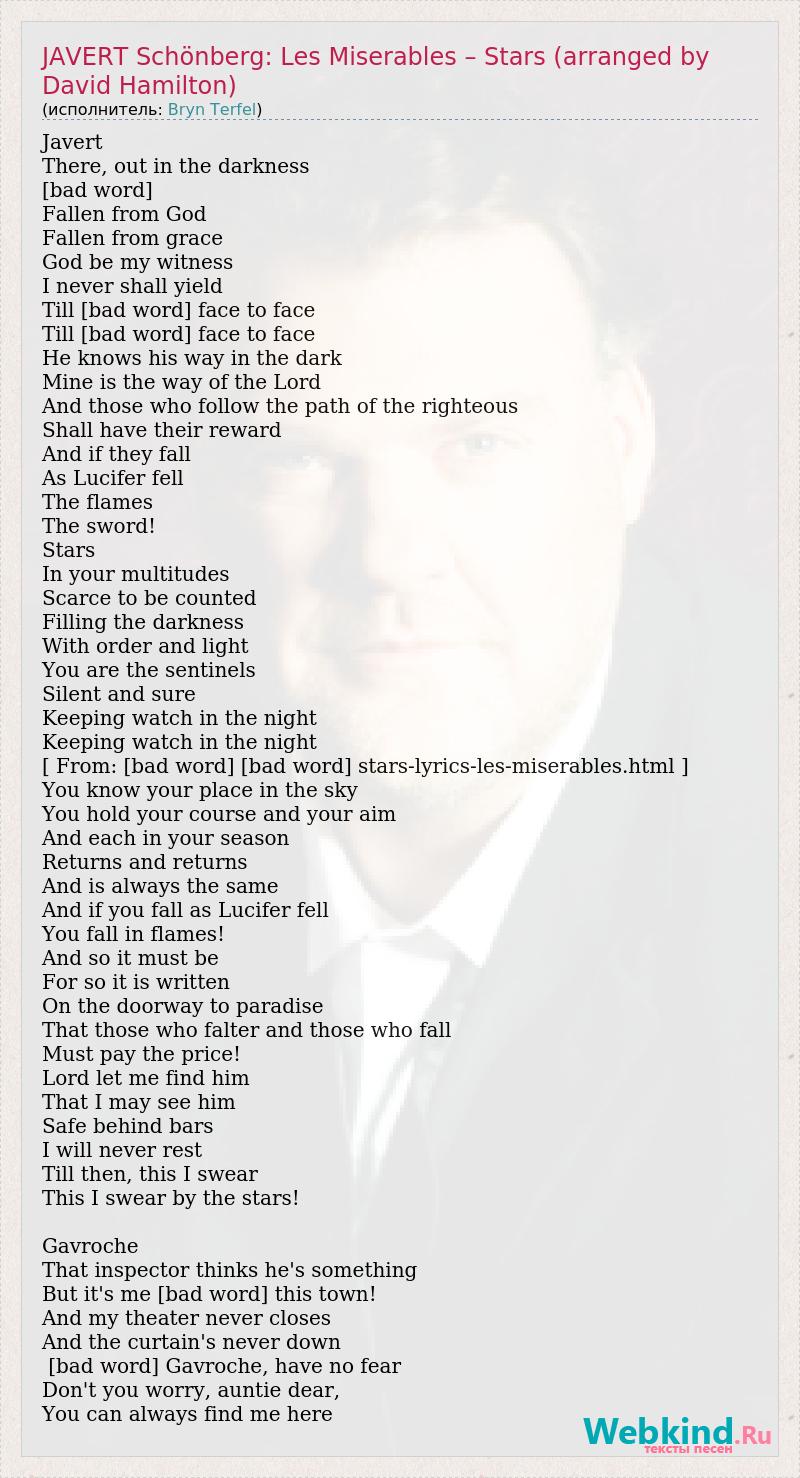 Javert There, out in the darkness [bad word] Fallen from God Fallen from grace God be my witness I never shall yield Till [bad word] face to face Till [bad word] face to face He knows his way in the dark Mine is the way of the Lord And those who follow the path of the righteous Shall have their reward And if they fall As Lucifer fell The flames The sword! Stars In your multitudes Scarce to be counted Filling the darkness With order and light You are the sentinels Silent and sure Keeping watch in the night Keeping watch in the night [ From: [bad word] [bad word] stars-lyrics-les-miserables.html ] You know your place in the sky You hold your course and your aim And each in your season Returns and returns And is always the same And if you fall as Lucifer fell You fall in flames! And so it must be For so it is written On the doorway to paradise That those who falter and those who fall Must pay the price! Lord let me find him That I may see him Safe behind bars I will never rest Till then, this I swear This I swear by the stars! Gavroche That inspector thinks he's something But it's me [bad word] this town! And my theater never closes And the curtain's never down [bad word] Gavroche, have no fear Don't you worry, auntie dear, You can always find me here
