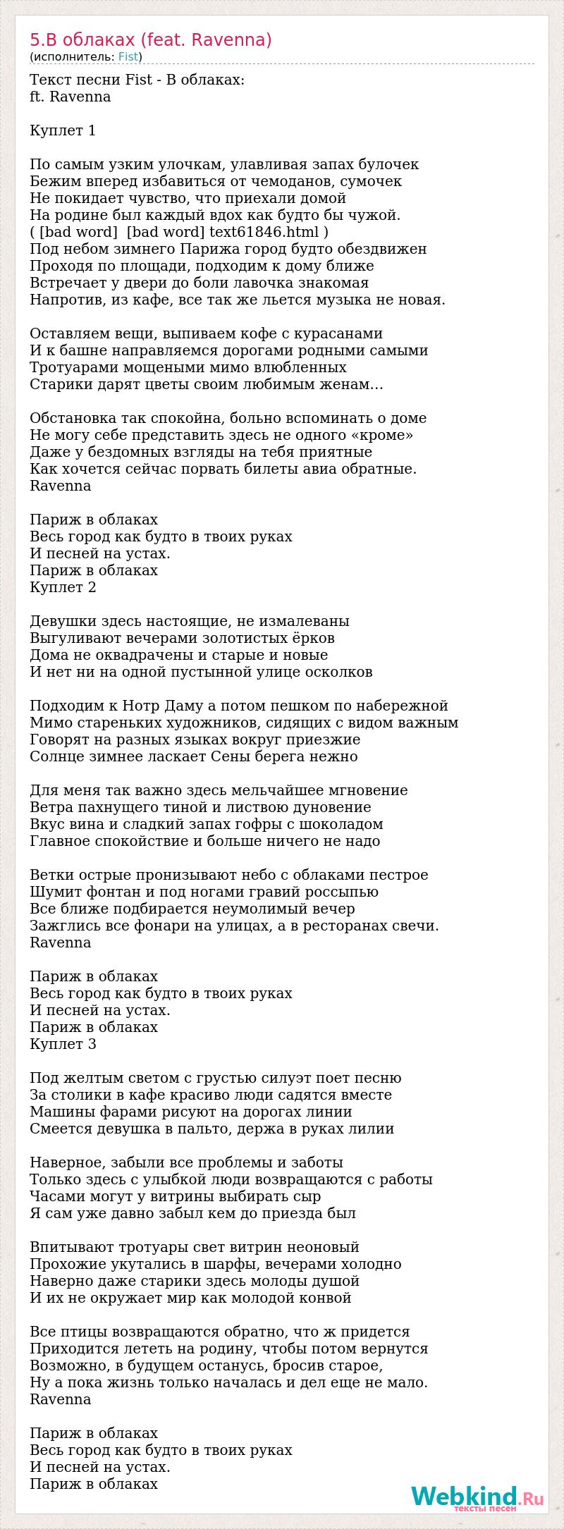 Текст песни Fist - В облаках: ft. Ravenna Куплет 1 По самым узким улочкам, улавливая запах булочек Бежим вперед избавиться от чемоданов, сумочек Не покидает чувство, что приехали домой На родине был каждый вдох как будто бы чужой. ( [bad word] [bad word] text61846.html ) Под небом зимнего Парижа город будто обездвижен Проходя по площади, подходим к дому ближе Встречает у двери до боли лавочка знакомая Напротив, из кафе, все так же льется музыка не новая. Оставляем вещи, выпиваем кофе с курасанами И к башне направляемся дорогами родными самыми Тротуарами мощеными мимо влюбленных Старики дарят цветы своим любимым женам… Обстановка так спокойна, больно вспоминать о доме Не могу себе представить здесь не одного «кроме» Даже у бездомных взгляды на тебя приятные Как хочется сейчас порвать билеты авиа обратные. Ravenna Париж в облаках Весь город как будто в твоих руках И песней на устах. Париж в облаках Куплет 2 Девушки здесь настоящие, не измалеваны Выгуливают вечерами золотистых ёрков Дома не оквадрачены и старые и новые И нет ни на одной пустынной улице осколков Подходим к Нотр Даму а потом пешком по набережной Мимо стареньких художников, сидящих с видом важным Говорят на разных языках вокруг приезжие Солнце зимнее ласкает Сены берега нежно Для меня так важно здесь мельчайшее мгновение Ветра пахнущего тиной и листвою дуновение Вкус вина и сладкий запах гофры с шоколадом Главное спокойствие и больше ничего не надо Ветки острые пронизывают небо с облаками пестрое Шумит фонтан и под ногами гравий россыпью Все ближе подбирается неумолимый вечер Зажглись все фонари на улицах, а в ресторанах свечи. Ravenna Париж в облаках Весь город как будто в твоих руках И песней на устах. Париж в облаках Куплет 3 Под желтым светом с грустью силуэт поет песню За столики в кафе красиво люди садятся вместе Машины фарами рисуют на дорогах линии Смеется девушка в пальто, держа в руках лилии Наверное, забыли все проблемы и заботы Только здесь с улыбкой люди возвращаются с работы Часами могут у витрины выбирать сыр Я сам уже давно забыл кем до приезда был Впитывают тротуары свет витрин неоновый Прохожие укутались в шарфы, вечерами холодно Наверно даже старики здесь молоды душой И их не окружает мир как молодой конвой Все птицы возвращаются обратно, что ж придется Приходится лететь на родину, чтобы потом вернутся Возможно, в будущем останусь, бросив старое, Ну а пока жизнь только началась и дел еще не мало. Ravenna Париж в облаках Весь город как будто в твоих руках И песней на устах. Париж в облаках