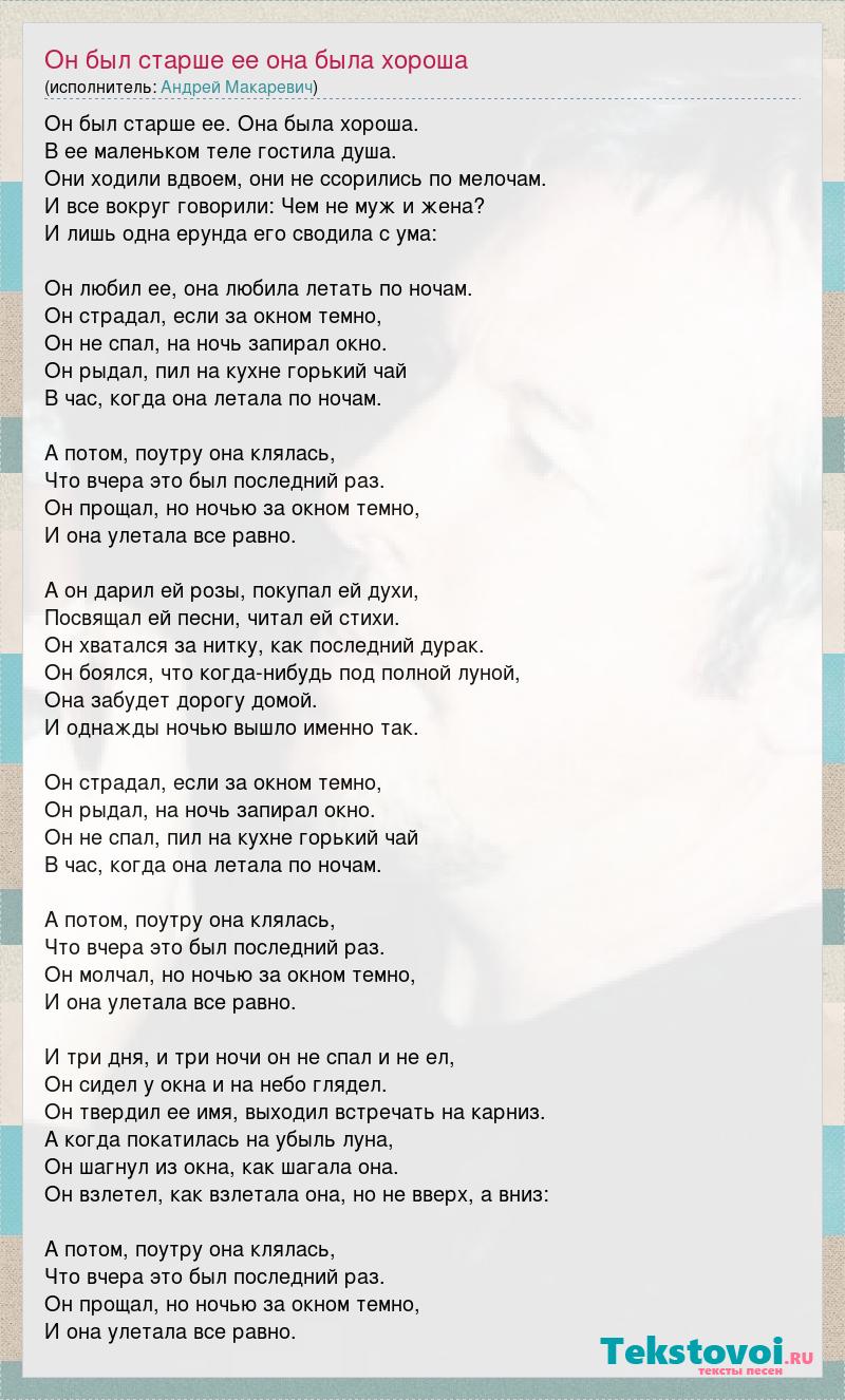 Он был старше ее. Она была хороша. В ее маленьком теле гостила душа. Они ходили вдвоем, они не ссорились по мелочам. И все вокруг говорили: Чем не муж и жена? И лишь одна ерунда его сводила с ума: Он любил ее, она любила летать по ночам. Он страдал, если за окном темно, Он не спал, на ночь запирал окно. Он рыдал, пил на кухне горький чай В час, когда она летала по ночам. А потом, поутру она клялась, Что вчера это был последний раз. Он прощал, но ночью за окном темно, И она улетала все равно. А он дарил ей розы, покупал ей духи, Посвящал ей песни, читал ей стихи. Он хватался за нитку, как последний дурак. Он боялся, что когда-нибудь под полной луной, Она забудет дорогу домой. И однажды ночью вышло именно так. Он страдал, если за окном темно, Он рыдал, на ночь запирал окно. Он не спал, пил на кухне горький чай В час, когда она летала по ночам. А потом, поутру она клялась, Что вчера это был последний раз. Он молчал, но ночью за окном темно, И она улетала все равно. И три дня, и три ночи он не спал и не ел, Он сидел у окна и на небо глядел. Он твердил ее имя, выходил встречать на карниз. А когда покатилась на убыль луна, Он шагнул из окна, как шагала она. Он взлетел, как взлетала она, но не вверх, а вниз: А потом, поутру она клялась, Что вчера это был последний раз. Он прощал, но ночью за окном темно, И она улетала все равно.