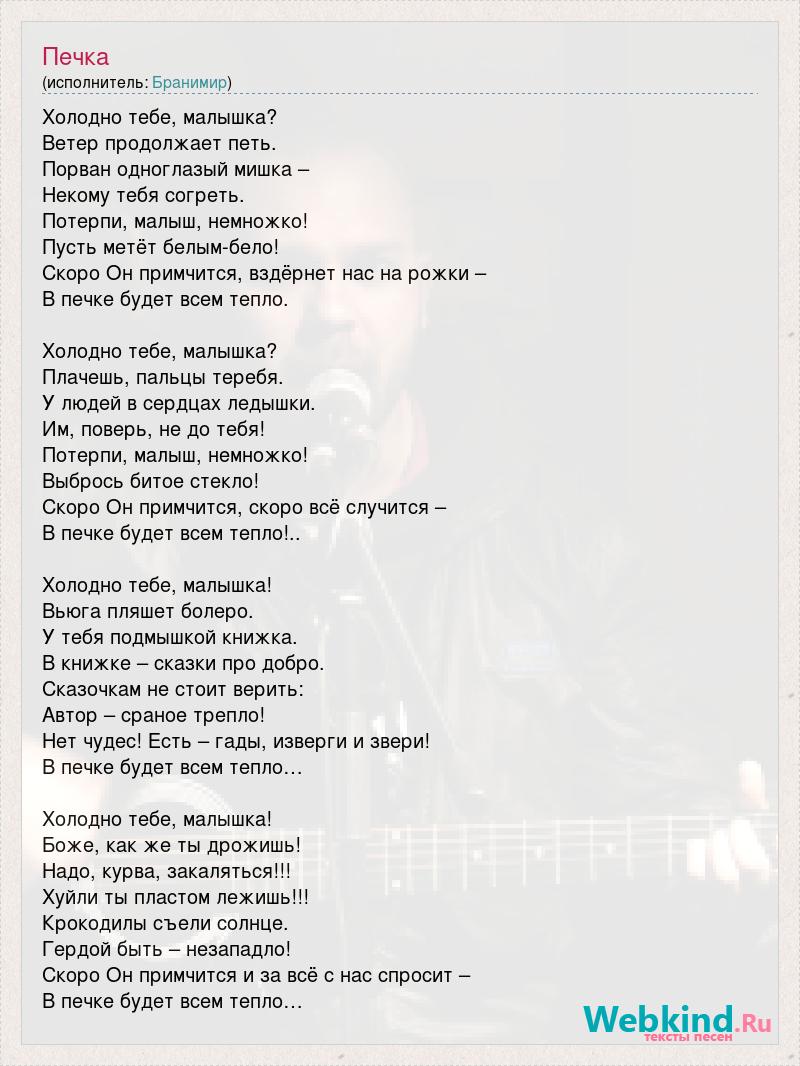Холодно тебе, малышка? Ветер продолжает петь. Порван одноглазый мишка – Некому тебя согреть. Потерпи, малыш, немножко! Пусть метёт белым-бело! Скоро Он примчится, вздёрнет нас на рожки – В печке будет всем тепло. Холодно тебе, малышка? Плачешь, пальцы теребя. У людей в сердцах ледышки. Им, поверь, не до тебя! Потерпи, малыш, немножко! Выбрось битое стекло! Скоро Он примчится, скоро всё случится – В печке будет всем тепло!.. Холодно тебе, малышка! Вьюга пляшет болеро. У тебя подмышкой книжка. В книжке – сказки про добро. Сказочкам не стоит верить: Автор – сраное трепло! Нет чудес! Есть – гады, изверги и звери! В печке будет всем тепло… Холодно тебе, малышка! Боже, как же ты дрожишь! Надо, курва, закаляться!!! Хуйли ты пластом лежишь!!! Крокодилы съели солнце. Гердой быть – незападло! Скоро Он примчится и за всё с нас спросит – В печке будет всем тепло…