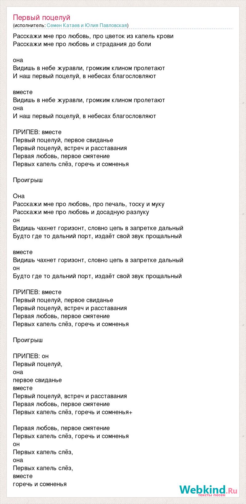 Расскажи мне про любовь, про цветок из капель крови Расскажи мне про любовь и страдания до боли она Видишь в небе журавли, громким клином пролетают И наш первый поцелуй, в небесах благословляют вместе Видишь в небе журавли, громким клином пролетают она И наш первый поцелуй, в небесах благословляют ПРИПЕВ: вместе Первый поцелуй, первое свиданье Первый поцелуй, встреч и расставания Первая любовь, первое смятение Первых капель слёз, горечь и сомненья Проигрыш Она Расскажи мне про любовь, про печаль, тоску и муку Расскажи мне про любовь и досадную разлуку он Видишь чахнет горизонт, словно цепь в запретке дальный Будто где то дальний порт, издаёт свой звук прощальный вместе Видишь чахнет горизонт, словно цепь в запретке дальный он Будто где то дальний порт, издаёт свой звук прощальный ПРИПЕВ: вместе Первый поцелуй, первое свиданье Первый поцелуй, встреч и расставания Первая любовь, первое смятение Первых капель слёз, горечь и сомненья Проигрыш ПРИПЕВ: он Первый поцелуй, она первое свиданье вместе Первый поцелуй, встреч и расставания Первая любовь, первое смятение Первых капель слёз, горечь и сомненья+ Первая любовь, первое смятение Первых капель слёз, горечь и сомненья он Первых капель слёз, она Первых капель слёз, вместе горечь и сомненья