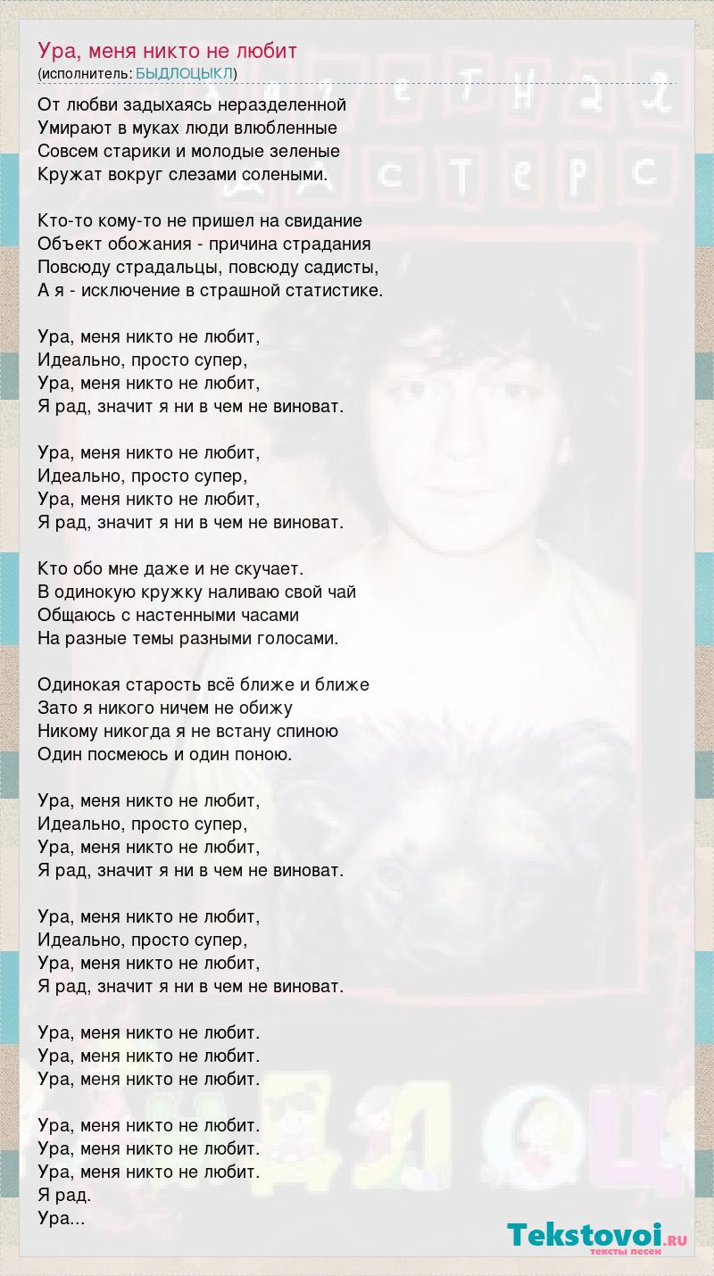 От любви задыхаясь неразделенной Умирают в муках люди влюбленные Совсем старики и молодые зеленые Кружат вокруг слезами солеными. Кто-то кому-то не пришел на свидание Объект обожания - причина страдания Повсюду страдальцы, повсюду садисты, А я - исключение в страшной статистике. Ура, меня никто не любит, Идеально, просто супер, Ура, меня никто не любит, Я рад, значит я ни в чем не виноват. Ура, меня никто не любит, Идеально, просто супер, Ура, меня никто не любит, Я рад, значит я ни в чем не виноват. Кто обо мне даже и не скучает. В одинокую кружку наливаю свой чай Общаюсь с настенными часами На разные темы разными голосами. Одинокая старость всё ближе и ближе Зато я никого ничем не обижу Никому никогда я не встану спиною Один посмеюсь и один поною. Ура, меня никто не любит, Идеально, просто супер, Ура, меня никто не любит, Я рад, значит я ни в чем не виноват. Ура, меня никто не любит, Идеально, просто супер, Ура, меня никто не любит, Я рад, значит я ни в чем не виноват. Ура, меня никто не любит. Ура, меня никто не любит. Ура, меня никто не любит. Ура, меня никто не любит. Ура, меня никто не любит. Ура, меня никто не любит. Я рад. Ура...