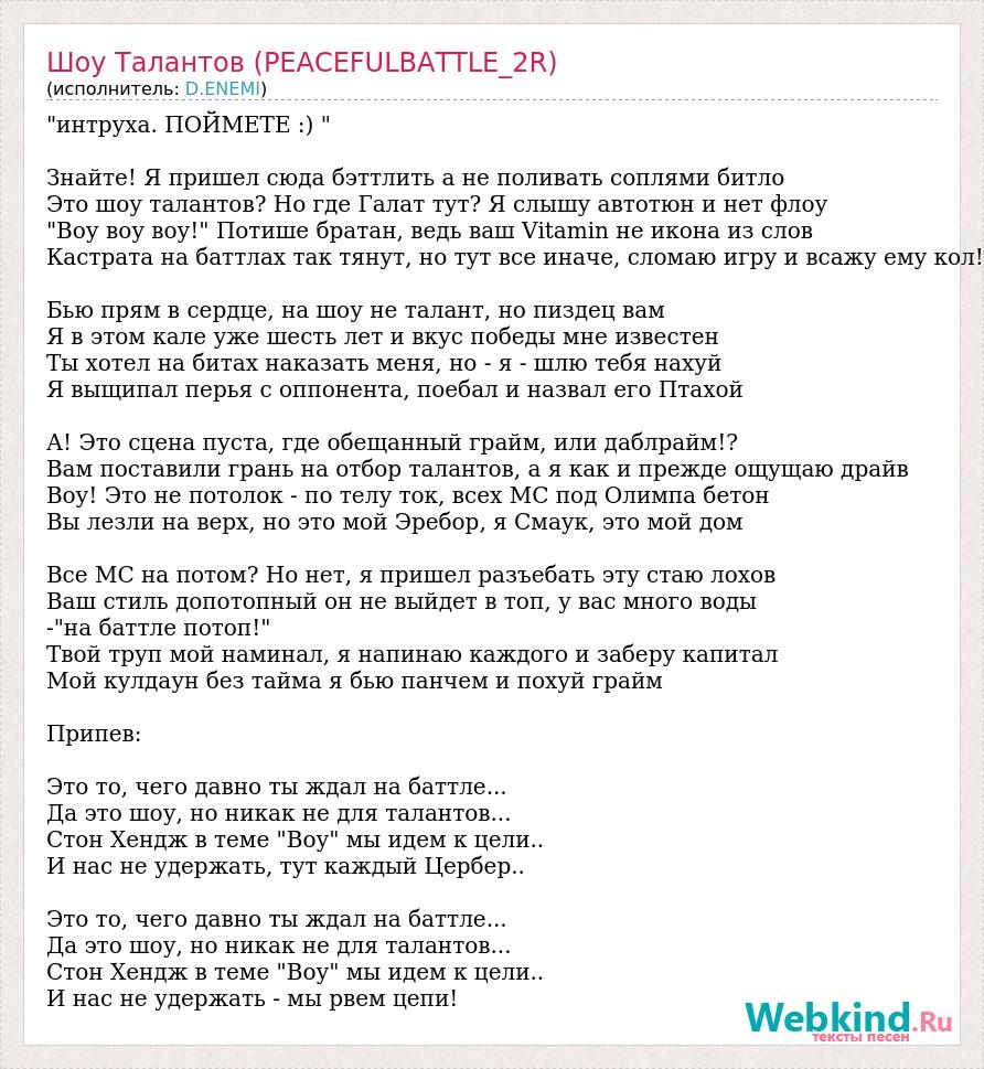 "интруха. ПОЙМЕТЕ :) " Знайте! Я пришел сюда бэттлить а не поливать соплями битло Это шоу талантов? Но где Галат тут? Я слышу автотюн и нет флоу "Воу воу воу!" Потише братан, ведь ваш Vitamin не икона из слов Кастрата на баттлах так тянут, но тут все иначе, сломаю игру и всажу ему кол! Бью прям в сердце, на шоу не талант, но пиздец вам Я в этом кале уже шесть лет и вкус победы мне известен Ты хотел на битах наказать меня, но - я - шлю тебя нахуй Я выщипал перья с оппонента, поебал и назвал его Птахой А! Это сцена пуста, где обещанный грайм, или даблрайм!? Вам поставили грань на отбор талантов, а я как и прежде ощущаю драйв Воу! Это не потолок - по телу ток, всех МС под Олимпа бетон Вы лезли на верх, но это мой Эребор, я Смаук, это мой дом Все МС на потом? Но нет, я пришел разъебать эту стаю лохов Ваш стиль допотопный он не выйдет в топ, у вас много воды -"на баттле потоп!" Твой труп мой наминал, я напинаю каждого и заберу капитал Мой кулдаун без тайма я бью панчем и похуй грайм Припев: Это то, чего давно ты ждал на баттле... Да это шоу, но никак не для талантов... Стон Хендж в теме "Воу" мы идем к цели.. И нас не удержать, тут каждый Цербер.. Это то, чего давно ты ждал на баттле... Да это шоу, но никак не для талантов... Стон Хендж в теме "Воу" мы идем к цели.. И нас не удержать - мы рвем цепи!