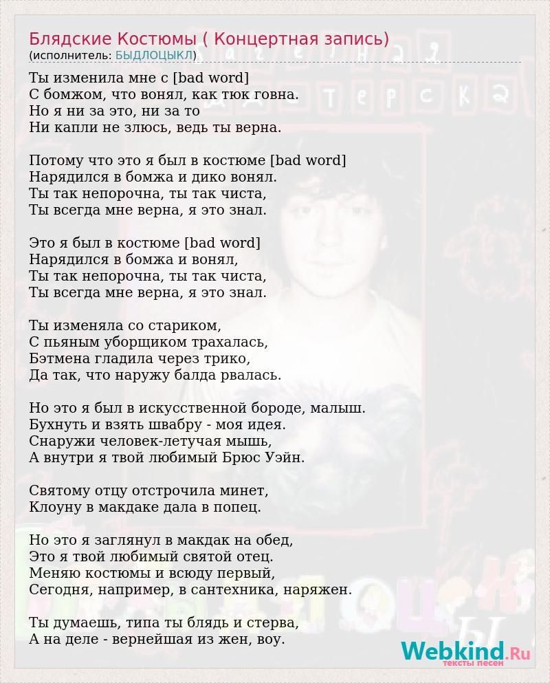 Ты изменила мне с [bad word] С бомжом, что вонял, как тюк говна. Но я ни за это, ни за то Ни капли не злюсь, ведь ты верна. Потому что это я был в костюме [bad word] Нарядился в бомжа и дико вонял. Ты так непорочна, ты так чиста, Ты всегда мне верна, я это знал. Это я был в костюме [bad word] Нарядился в бомжа и вонял, Ты так непорочна, ты так чиста, Ты всегда мне верна, я это знал. Ты изменяла со стариком, С пьяным уборщиком трахалась, Бэтмена гладила через трико, Да так, что наружу балда рвалась. Но это я был в искусственной бороде, малыш. Бухнуть и взять швабру - моя идея. Снаружи человек-летучая мышь, А внутри я твой любимый Брюс Уэйн. Святому отцу отстрочила минет, Клоуну в макдаке дала в попец. Но это я заглянул в макдак на обед, Это я твой любимый святой отец. Меняю костюмы и всюду первый, Сегодня, например, в сантехника, наряжен. Ты думаешь, типа ты блядь и стерва, А на деле - вернейшая из жен, воу.