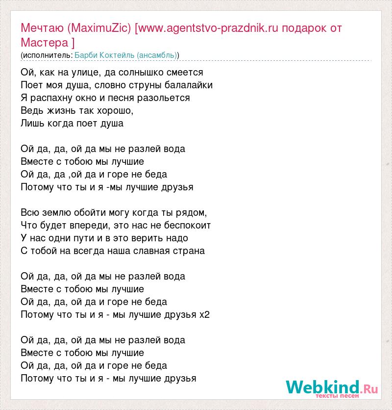 Ой, как на улице, да солнышко смеется Поет моя душа, словно струны балалайки Я распахну окно и песня разольется Ведь жизнь так хорошо, Лишь когда поет душа Ой да, да, ой да мы не разлей вода Вместе с тобою мы лучшие Ой да, да ,ой да и горе не беда Потому что ты и я -мы лучшие друзья Всю землю обойти могу когда ты рядом, Что будет впереди, это нас не беспокоит У нас одни пути и в это верить надо С тобой на всегда наша славная страна Ой да, да, ой да мы не разлей вода Вместе с тобою мы лучшие Ой да, да, ой да и горе не беда Потому что ты и я - мы лучшие друзья х2 Ой да, да, ой да мы не разлей вода Вместе с тобою мы лучшие Ой да, да, ой да и горе не беда Потому что ты и я - мы лучшие друзья
