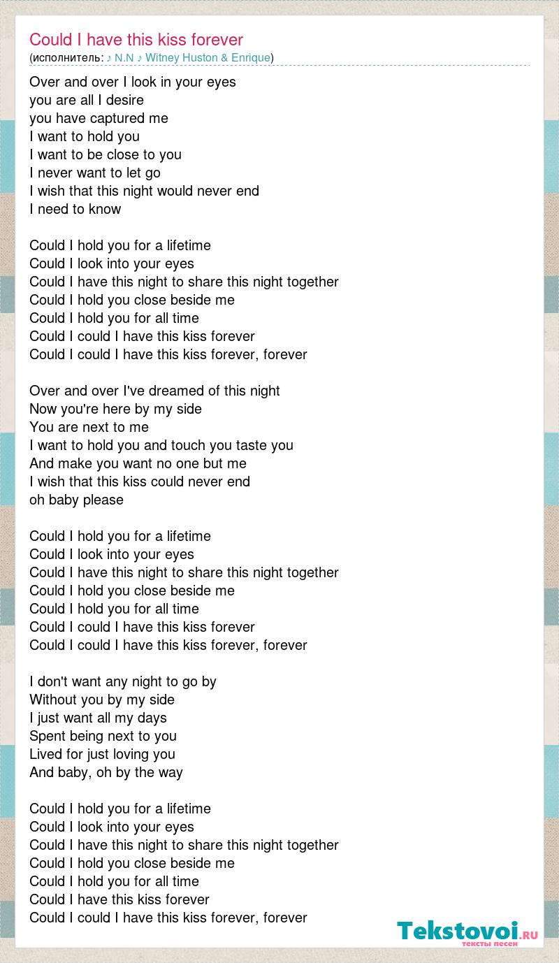 Over and over I look in your eyes you are all I desire you have captured me I want to hold you I want to be close to you I never want to let go I wish that this night would never end I need to know Could I hold you for a lifetime Could I look into your eyes Could I have this night to share this night together Could I hold you close beside me Could I hold you for all time Could I could I have this kiss forever Could I could I have this kiss forever, forever Over and over I've dreamed of this night Now you're here by my side You are next to me I want to hold you and touch you taste you And make you want no one but me I wish that this kiss could never end oh baby please Could I hold you for a lifetime Could I look into your eyes Could I have this night to share this night together Could I hold you close beside me Could I hold you for all time Could I could I have this kiss forever Could I could I have this kiss forever, forever I don't want any night to go by Without you by my side I just want all my days Spent being next to you Lived for just loving you And baby, oh by the way Could I hold you for a lifetime Could I look into your eyes Could I have this night to share this night together Could I hold you close beside me Could I hold you for all time Could I have this kiss forever Could I could I have this kiss forever, forever
