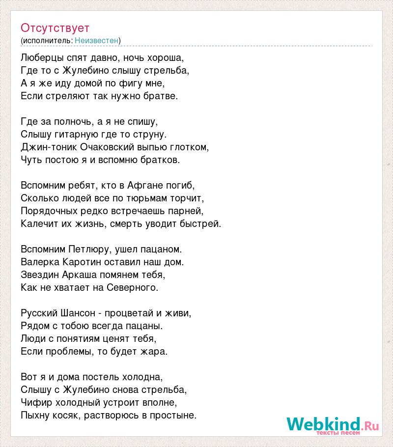 Люберцы спят давно, ночь хороша, Где то с Жулебино слышу стрельба, А я же иду домой по фигу мне, Если стреляют так нужно братве. Где за полночь, а я не спишу, Слышу гитарную где то струну. Джин-тоник Очаковский выпью глотком, Чуть постою я и вспомню братков. Вспомним ребят, кто в Афгане погиб, Сколько людей все по тюрьмам торчит, Порядочных редко встречаешь парней, Калечит их жизнь, смерть уводит быстрей. Вспомним Петлюру, ушел пацаном. Валерка Каротин оставил наш дом. Звездин Аркаша помянем тебя, Как не хватает на Северного. Русский Шансон - процветай и живи, Рядом с тобою всегда пацаны. Люди с понятиям ценят тебя, Если проблемы, то будет жара. Вот я и дома постель холодна, Слышу с Жулебино снова стрельба, Чифир холодный устроит вполне, Пыхну косяк, растворюсь в простыне.