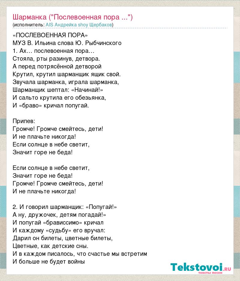 «ПОСЛЕВОЕННАЯ ПОРА» МУЗ В. Ильина слова Ю. Рыбчинского 1. Ах… послевоенная пора… Стояла, рты разинув, детвора. А перед потрясённой детворой Крутил, крутил шарманщик ящик свой. Звучала шарманка, играла шарманка, Шарманщик шептал: «Начинай!» И сальто крутила его обезьянка, И «браво» кричал попугай. Припев: Громче! Громче смейтесь, дети! И не плачьте никогда! Если солнце в небе светит, Значит горе не беда! Если солнце в небе светит, Значит горе не беда! Громче! Громче смейтесь, дети! И не плачьте никогда! 2. И говорил шарманщик: «Попугай!» А ну, дружочек, детям погадай!» И попугай «брависсимо» кричал И каждому «судьбу» его вручал: Дарил он билеты, цветные билеты, Цветные, как детские сны. И в каждом писалось, что счастье мы встретим И больше не будет войны