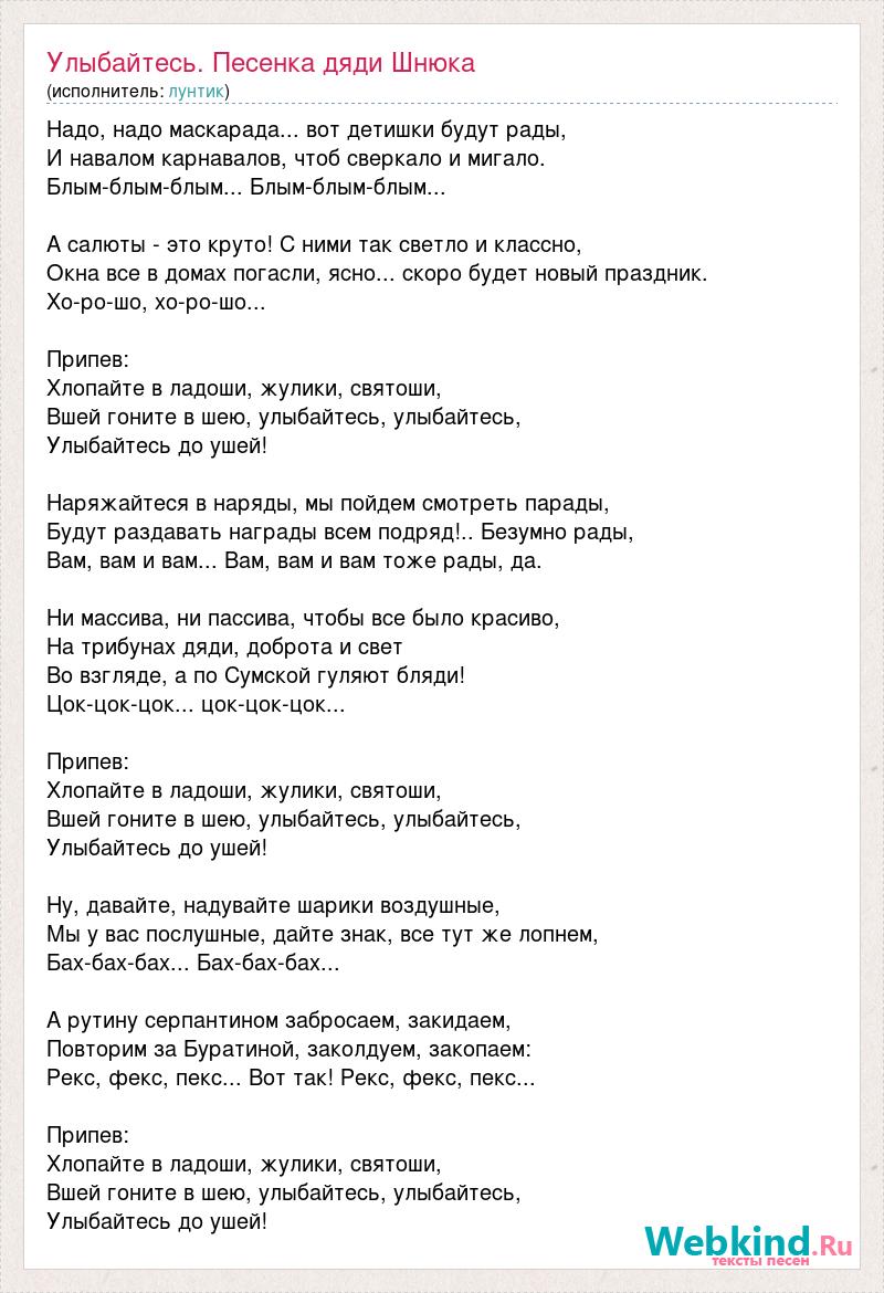 Надо, надо маскарада... вот детишки будут рады, И навалом карнавалов, чтоб сверкало и мигало. Блым-блым-блым... Блым-блым-блым... А салюты - это круто! С ними так светло и классно, Окна все в домах погасли, ясно... скоро будет новый праздник. Хо-ро-шо, хо-ро-шо... Припев: Хлопайте в ладоши, жулики, святоши, Вшей гоните в шею, улыбайтесь, улыбайтесь, Улыбайтесь до ушей! Наряжайтеся в наряды, мы пойдем смотреть парады, Будут раздавать награды всем подряд!.. Безумно рады, Вам, вам и вам... Вам, вам и вам тоже рады, да. Ни массива, ни пассива, чтобы все было красиво, На трибунах дяди, доброта и свет Во взгляде, а по Сумской гуляют бляди! Цок-цок-цок... цок-цок-цок... Припев: Хлопайте в ладоши, жулики, святоши, Вшей гоните в шею, улыбайтесь, улыбайтесь, Улыбайтесь до ушей! Ну, давайте, надувайте шарики воздушные, Мы у вас послушные, дайте знак, все тут же лопнем, Бах-бах-бах... Бах-бах-бах... А рутину серпантином забросаем, закидаем, Повторим за Буратиной, заколдуем, закопаем: Рекс, фекс, пекс... Вот так! Рекс, фекс, пекс... Припев: Хлопайте в ладоши, жулики, святоши, Вшей гоните в шею, улыбайтесь, улыбайтесь, Улыбайтесь до ушей!
