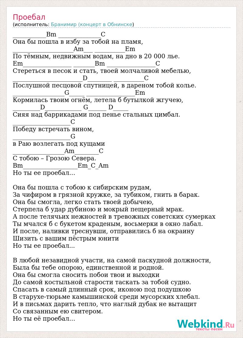 ___________Bm ______________C Она бы пошла в избу за тобой на пламя, ____________________Am___ __________Em По тёмным, недвижным водам, на дно в 20 000 лье. Em________________ _______Bm ________________C Стереться в песок и стать, твоей молчаливой мебелью, _______________________D________ __________C Послушной песцовой спутницей, в дареном тобой колье. _________________G_____ ________________Em Кормилась твоим огнём, летела б бутылкой жгучею, _________D____________ G______ D_____ Сияя над баррикадами под пенье стальных цимбал. ___________________C Победу встречать вином, ___________________G в Раю возлегать под кущами _________________Am________C С тобою – Грозою Севера. Bm__________________Em_C_Am Но ты ее проебал… Она бы пошла с тобою к сибирским рудам, За чифиром в грязной кружке, за тубиком, гнить в барак. Она бы смогла, легко стать твоей добычею, Стерпела б удар дубиною и мокрый пещерный мрак. А после телячьих нежностей в тревожных советских сумерках Ты мчался б с букетом краденым, восьмерки в окно лабал. И после, наливки треснувши, отправились б на окраину Шизить с вашим пёстрым юнити Но ты ее проебал... В любой незавидной участи, на самой паскудной должности, Была бы тебе опорою, единственной и родной. Она бы смогла сносить побои твои и выходки До самой костыльной старости таскать за тобой судно. Спасать в самый длинный срок, иконою под подушкою В старухе-тюрьме камышинской среди мусорских хлебал. И в письмах дарить тепло, что наглый дубак не вытащит Со связанным ею свитером. Но ты её проебал…