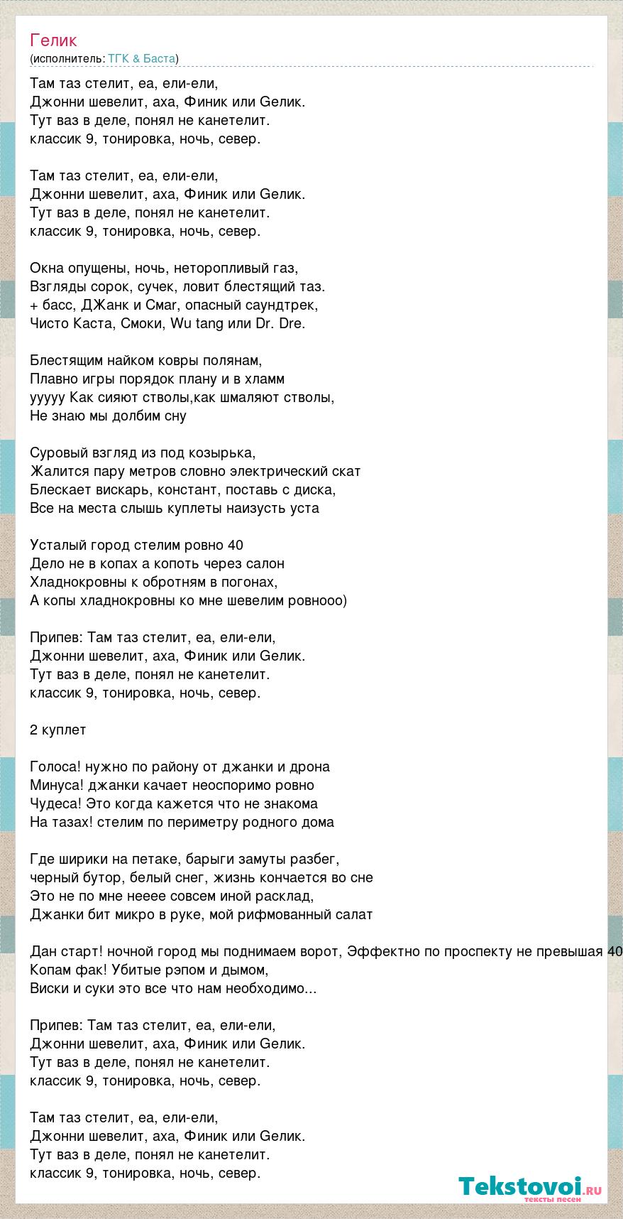 Там таз стелит, еа, ели-ели, Джонни шевелит, аха, Финик или Gелик. Тут ваз в деле, понял не канетелит. классик 9, тонировка, ночь, север. Там таз стелит, еа, ели-ели, Джонни шевелит, аха, Финик или Gелик. Тут ваз в деле, понял не канетелит. классик 9, тонировка, ночь, север. Окна опущены, ночь, неторопливый газ, Взгляды сорок, сучек, ловит блестящий таз. + басс, ДЖанк и Смаr, опасный саундтрек, Чисто Каста, Смоки, Wu tang или Dr. Dre. Блестящим найком ковры полянам, Плавно игры порядок плану и в хламм ууууу Как сияют стволы,как шмаляют стволы, Не знаю мы долбим сну Суровый взгляд из под козырька, Жалится пару метров словно электрический скат Блескает вискарь, констант, поставь с диска, Все на места слышь куплеты наизусть уста Усталый город стелим ровно 40 Дело не в копах а копоть через салон Хладнокровны к обротням в погонах, А копы хладнокровны ко мне шевелим ровнооо) Припев: Там таз стелит, еа, ели-ели, Джонни шевелит, аха, Финик или Gелик. Тут ваз в деле, понял не канетелит. классик 9, тонировка, ночь, север. 2 куплет Голоса! нужно по району от джанки и дрона Минуса! джанки качает неоспоримо ровно Чудеса! Это когда кажется что не знакома На тазах! стелим по периметру родного дома Где ширики на петаке, барыги замуты разбег, черный бутор, белый снег, жизнь кончается во сне Это не по мне нееее совсем иной расклад, Джанки бит микро в руке, мой рифмованный салат Дан старт! ночной город мы поднимаем ворот, Эффектно по проспекту не превышая 40 Копам фак! Убитые рэпом и дымом, Виски и суки это все что нам необходимо... Припев: Там таз стелит, еа, ели-ели, Джонни шевелит, аха, Финик или Gелик. Тут ваз в деле, понял не канетелит. классик 9, тонировка, ночь, север. Там таз стелит, еа, ели-ели, Джонни шевелит, аха, Финик или Gелик. Тут ваз в деле, понял не канетелит. классик 9, тонировка, ночь, север.