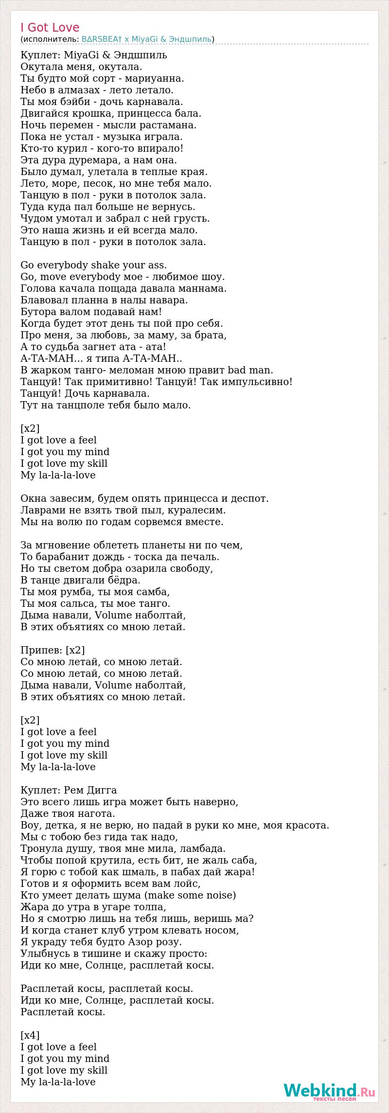 Куплет: MiyaGi & Эндшпиль Окутала меня, окутала. Ты будто мой сорт - мариуанна. Небо в алмазах - лето летало. Ты моя бэйби - дочь карнавала. Двигайся крошка, принцесса бала. Ночь перемен - мысли растамана. Пока не устал - музыка играла. Кто-то курил - кого-то впирало! Эта дура дуремара, а нам она. Было думал, улетала в теплые края. Лето, море, песок, но мне тебя мало. Танцую в пол - руки в потолок зала. Туда куда пал больше не вернусь. Чудом умотал и забрал с ней грусть. Это наша жизнь и ей всегда мало. Танцую в пол - руки в потолок зала. Go everybody shake your ass. Go, move everybody мое - любимое шоу. Голова качала пощада давала маннама. Блавовал планна в налы навара. Бутора валом подавай нам! Когда будет этот день ты пой про себя. Про меня, за любовь, за маму, за брата, А то судьба загнет ата - ата! А-ТА-МАН... я типа А-ТА-МАН.. В жарком танго- меломан мною правит bad man. Танцуй! Так примитивно! Танцуй! Так импульсивно! Танцуй! Дочь карнавала. Тут на танцполе тебя было мало. [x2] I got love a feel I got you my mind I got love my skill My la-la-la-love Окна завесим, будем опять принцесса и деспот. Лаврами не взять твой пыл, куралесим. Мы на волю по годам сорвемся вместе. За мгновение облететь планеты ни по чем, То барабанит дождь - тоска да печаль. Но ты светом добра озарила свободу, В танце двигали бёдра. Ты моя румба, ты моя самба, Ты моя сальса, ты мое танго. Дыма навали, Volume наболтай, В этих объятиях со мною летай. Припев: [х2] Со мною летай, со мною летай. Со мною летай, со мною летай. Дыма навали, Volume наболтай, В этих объятиях со мною летай. [х2] I got love a feel I got you my mind I got love my skill My la-la-la-love Куплет: Рем Дигга Это всего лишь игра может быть наверно, Даже твоя нагота. Воу, детка, я не верю, но падай в руки ко мне, моя красота. Мы с тобою без гида так надо, Тронула душу, твоя мне мила, ламбада. Чтобы попой крутила, есть бит, не жаль саба, Я горю с тобой как шмаль, в пабах дай жара! Готов и я оформить всем вам лойс, Кто умеет делать шума (make some noise) Жара до утра в угаре толпа, Но я смотрю лишь на тебя лишь, веришь ма? И когда станет клуб утром клевать носом, Я украду тебя будто Азор розу. Улыбнусь в тишине и скажу просто: Иди ко мне, Солнце, расплетай косы. Расплетай косы, расплетай косы. Иди ко мне, Солнце, расплетай косы. Расплетай косы. [x4] I got love a feel I got you my mind I got love my skill My la-la-la-love