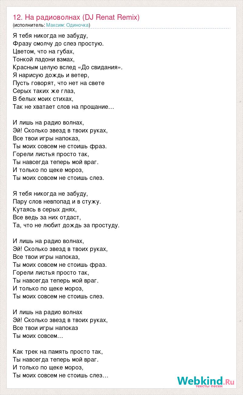 Я тебя никогда не забуду, Фразу смолчу до слез простую. Цветом, что на губах, Тонкой ладони взмах, Красным целую вслед «До свидания». Я нарисую дождь и ветер, Пусть говорят, что нет на свете Серых таких же глаз, В белых моих стихах, Так не хватает слов на прощание… И лишь на радио волнах, Эй! Сколько звезд в твоих руках, Все твои игры напоказ, Ты моих совсем не стоишь фраз. Горели листья просто так, Ты навсегда теперь мой враг. И только по щеке мороз, Ты моих совсем не стоишь слез. Я тебя никогда не забуду, Пару слов невпопад и в стужу. Кутаясь в серых днях, Все ведь за них отдаст, Та, что не любит дождь за простуду. И лишь на радио волнах, Эй! Сколько звезд в твоих руках, Все твои игры напоказ, Ты моих совсем не стоишь фраз. Горели листья просто так, Ты навсегда теперь мой враг. И только по щеке мороз, Ты моих совсем не стоишь слез. И лишь на радио волнах Эй! Сколько звезд в твоих руках, Все твои игры напоказ Ты моих совсем… Как трек на память просто так, Ты навсегда теперь мой враг. И только по щеке мороз, Ты моих совсем не стоишь слез…