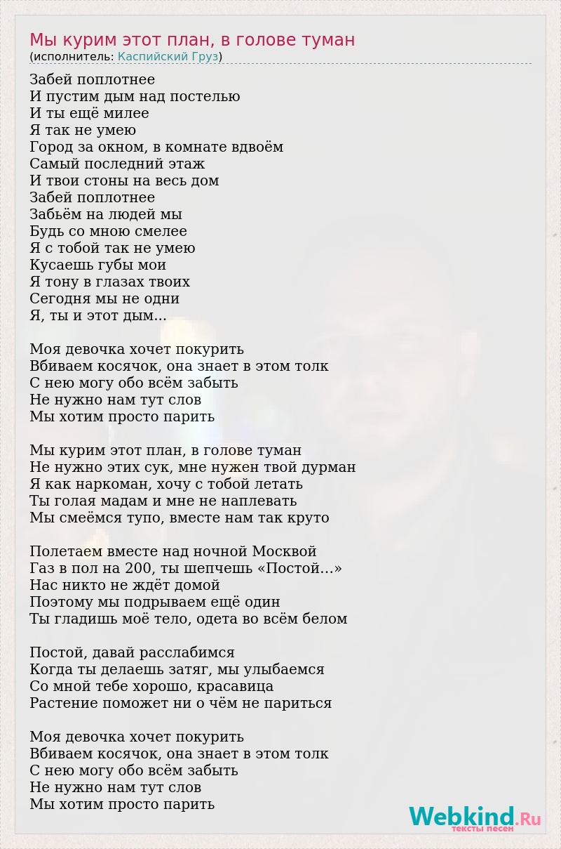 Забей поплотнее И пустим дым над постелью И ты ещё милее Я так не умею Город за окном, в комнате вдвоём Самый последний этаж И твои стоны на весь дом Забей поплотнее Забьём на людей мы Будь со мною смелее Я с тобой так не умею Кусаешь губы мои Я тону в глазах твоих Сегодня мы не одни Я, ты и этот дым... Моя девочка хочет покурить Вбиваем косячок, она знает в этом толк С нею могу обо всём забыть Не нужно нам тут слов Мы хотим просто парить Мы курим этот план, в голове туман Не нужно этих сук, мне нужен твой дурман Я как наркоман, хочу с тобой летать Ты голая мадам и мне не наплевать Мы смеёмся тупо, вместе нам так круто Полетаем вместе над ночной Москвой Газ в пол на 200, ты шепчешь «Постой…» Нас никто не ждёт домой Поэтому мы подрываем ещё один Ты гладишь моё тело, одета во всём белом Постой, давай расслабимся Когда ты делаешь затяг, мы улыбаемся Со мной тебе хорошо, красавица Растение поможет ни о чём не париться Моя девочка хочет покурить Вбиваем косячок, она знает в этом толк С нею могу обо всём забыть Не нужно нам тут слов Мы хотим просто парить