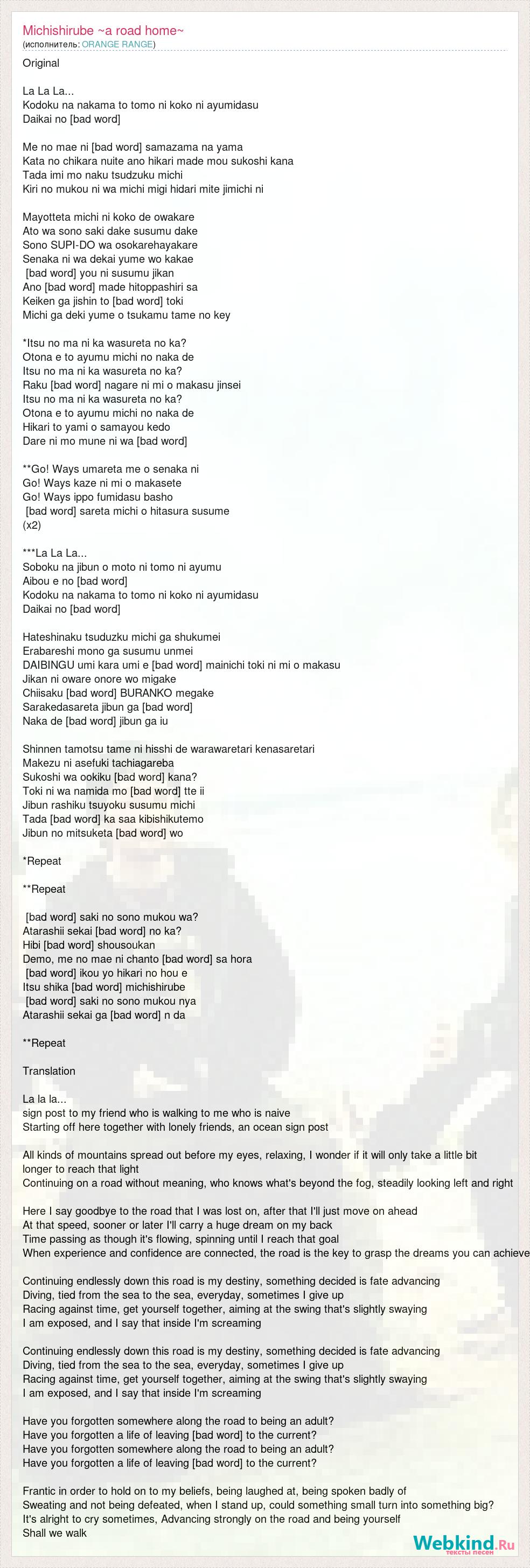 Original La La La... Kodoku na nakama to tomo ni koko ni ayumidasu Daikai no [bad word] Me no mae ni [bad word] samazama na yama Kata no chikara nuite ano hikari made mou sukoshi kana Tada imi mo naku tsudzuku michi Kiri no mukou ni wa michi migi hidari mite jimichi ni Mayotteta michi ni koko de owakare Ato wa sono saki dake susumu dake Sono SUPI-DO wa osokarehayakare Senaka ni wa dekai yume wo kakae [bad word] you ni susumu jikan Ano [bad word] made hitoppashiri sa Keiken ga jishin to [bad word] toki Michi ga deki yume o tsukamu tame no key *Itsu no ma ni ka wasureta no ka? Otona e to ayumu michi no naka de Itsu no ma ni ka wasureta no ka? Raku [bad word] nagare ni mi o makasu jinsei Itsu no ma ni ka wasureta no ka? Otona e to ayumu michi no naka de Hikari to yami o samayou kedo Dare ni mo mune ni wa [bad word] **Go! Ways umareta me o senaka ni Go! Ways kaze ni mi o makasete Go! Ways ippo fumidasu basho [bad word] sareta michi o hitasura susume (x2) ***La La La... Soboku na jibun o moto ni tomo ni ayumu Aibou e no [bad word] Kodoku na nakama to tomo ni koko ni ayumidasu Daikai no [bad word] Hateshinaku tsuduzku michi ga shukumei Erabareshi mono ga susumu unmei DAIBINGU umi kara umi e [bad word] mainichi toki ni mi o makasu Jikan ni oware onore wo migake Chiisaku [bad word] BURANKO megake Sarakedasareta jibun ga [bad word] Naka de [bad word] jibun ga iu Shinnen tamotsu tame ni hisshi de warawaretari kenasaretari Makezu ni asefuki tachiagareba Sukoshi wa ookiku [bad word] kana? Toki ni wa namida mo [bad word] tte ii Jibun rashiku tsuyoku susumu michi Tada [bad word] ka saa kibishikutemo Jibun no mitsuketa [bad word] wo *Repeat **Repeat [bad word] saki no sono mukou wa? Atarashii sekai [bad word] no ka? Hibi [bad word] shousoukan Demo, me no mae ni chanto [bad word] sa hora [bad word] ikou yo hikari no hou e Itsu shika [bad word] michishirube [bad word] saki no sono mukou nya Atarashii sekai ga [bad word] n da **Repeat Translation La la la... sign post to my friend who is walking to me who is naive Starting off here together with lonely friends, an ocean sign post All kinds of mountains spread out before my eyes, relaxing, I wonder if it will only take a little bit longer to reach that light Continuing on a road without meaning, who knows what's beyond the fog, steadily looking left and right Here I say goodbye to the road that I was lost on, after that I'll just move on ahead At that speed, sooner or later I'll carry a huge dream on my back Time passing as though it's flowing, spinning until I reach that goal When experience and confidence are connected, the road is the key to grasp the dreams you can achieve Continuing endlessly down this road is my destiny, something decided is fate advancing Diving, tied from the sea to the sea, everyday, sometimes I give up Racing against time, get yourself together, aiming at the swing that's slightly swaying I am exposed, and I say that inside I'm screaming Continuing endlessly down this road is my destiny, something decided is fate advancing Diving, tied from the sea to the sea, everyday, sometimes I give up Racing against time, get yourself together, aiming at the swing that's slightly swaying I am exposed, and I say that inside I'm screaming Have you forgotten somewhere along the road to being an adult? Have you forgotten a life of leaving [bad word] to the current? Have you forgotten somewhere along the road to being an adult? Have you forgotten a life of leaving [bad word] to the current? Frantic in order to hold on to my beliefs, being laughed at, being spoken badly of Sweating and not being defeated, when I stand up, could something small turn into something big? It's alright to cry sometimes, Advancing strongly on the road and being yourself Shall we walk
