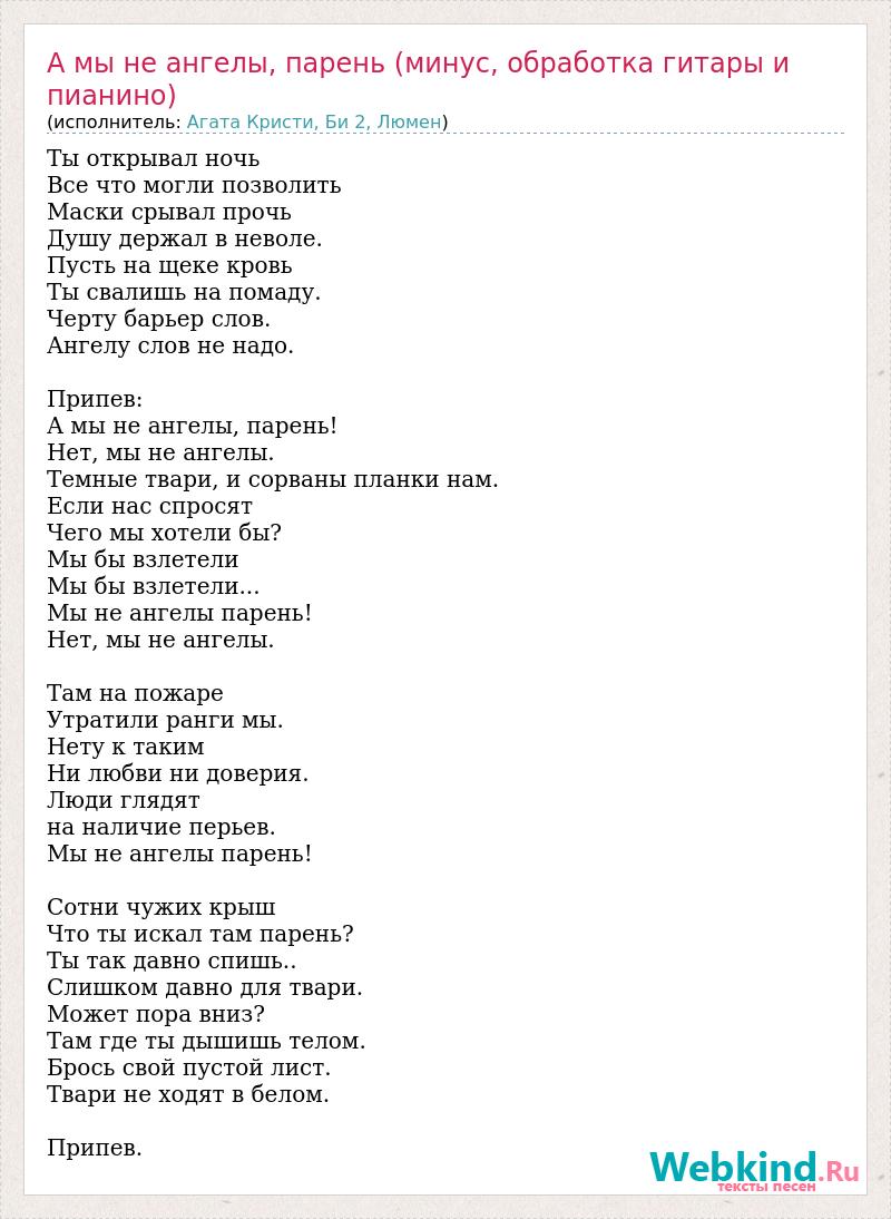 Ты открывал ночь Все что могли позволить Маски срывал прочь Душу держал в неволе. Пусть на щеке кровь Ты свалишь на помаду. Черту барьер слов. Ангелу слов не надо. Припев: А мы не ангелы, парень! Нет, мы не ангелы. Темные твари, и сорваны планки нам. Если нас спросят Чего мы хотели бы? Мы бы взлетели Мы бы взлетели... Мы не ангелы парень! Нет, мы не ангелы. Там на пожаре Утратили ранги мы. Нету к таким Ни любви ни доверия. Люди глядят на наличие перьев. Мы не ангелы парень! Сотни чужих крыш Что ты искал там парень? Ты так давно спишь.. Слишком давно для твари. Может пора вниз? Там где ты дышишь телом. Брось свой пустой лист. Твари не ходят в белом. Припев.