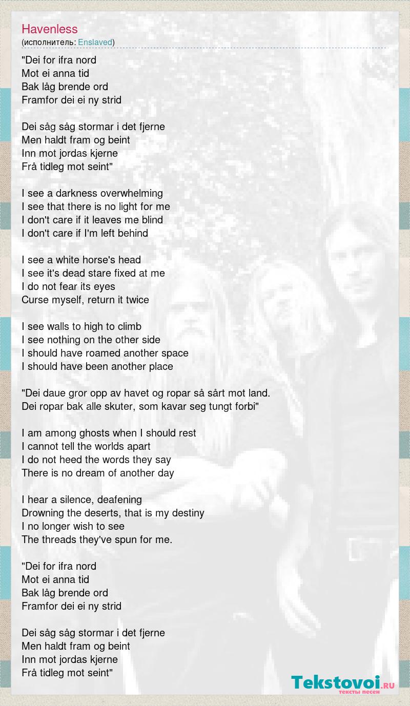 "Dei for ifra nord Mot ei anna tid Bak låg brende ord Framfor dei ei ny strid Dei såg såg stormar i det fjerne Men haldt fram og beint Inn mot jordas kjerne Frå tidleg mot seint" I see a darkness overwhelming I see that there is no light for me I don't care if it leaves me blind I don't care if I'm left behind I see a white horse's head I see it's dead stare fixed at me I do not fear its eyes Curse myself, return it twice I see walls to high to climb I see nothing on the other side I should have roamed another space I should have been another place "Dei daue gror opp av havet og ropar så sårt mot land. Dei ropar bak alle skuter, som kavar seg tungt forbi" I am among ghosts when I should rest I cannot tell the worlds apart I do not heed the words they say There is no dream of another day I hear a silence, deafening Drowning the deserts, that is my destiny I no longer wish to see The threads they've spun for me. "Dei for ifra nord Mot ei anna tid Bak låg brende ord Framfor dei ei ny strid Dei såg såg stormar i det fjerne Men haldt fram og beint Inn mot jordas kjerne Frå tidleg mot seint"