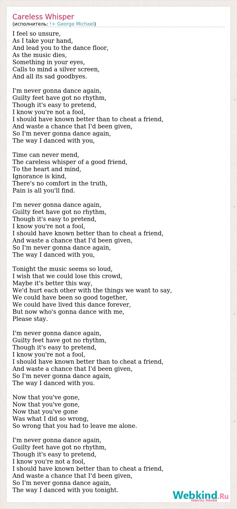 I feel so unsure, As I take your hand, And lead you to the dance floor, As the music dies, Something in your eyes, Calls to mind a silver screen, And all its sad goodbyes. I'm never gonna dance again, Guilty feet have got no rhythm, Though it's easy to pretend, I know you're not a fool, I should have known better than to cheat a friend, And waste a chance that I'd been given, So I'm never gonna dance again, The way I danced with you, Time can never mend, The careless whisper of a good friend, To the heart and mind, Ignorance is kind, There's no comfort in the truth, Pain is all you'll find. I'm never gonna dance again, Guilty feet have got no rhythm, Though it's easy to pretend, I know you're not a fool, I should have known better than to cheat a friend, And waste a chance that I'd been given, So I'm never gonna dance again, The way I danced with you, Tonight the music seems so loud, I wish that we could lose this crowd, Maybe it's better this way, We'd hurt each other with the things we want to say, We could have been so good together, We could have lived this dance forever, But now who's gonna dance with me, Please stay. I'm never gonna dance again, Guilty feet have got no rhythm, Though it's easy to pretend, I know you're not a fool, I should have known better than to cheat a friend, And waste a chance that I'd been given, So I'm never gonna dance again, The way I danced with you. Now that you've gone, Now that you've gone, Now that you've gone Was what I did so wrong, So wrong that you had to leave me alone. I'm never gonna dance again, Guilty feet have got no rhythm, Though it's easy to pretend, I know you're not a fool, I should have known better than to cheat a friend, And waste a chance that I'd been given, So I'm never gonna dance again, The way I danced with you tonight.