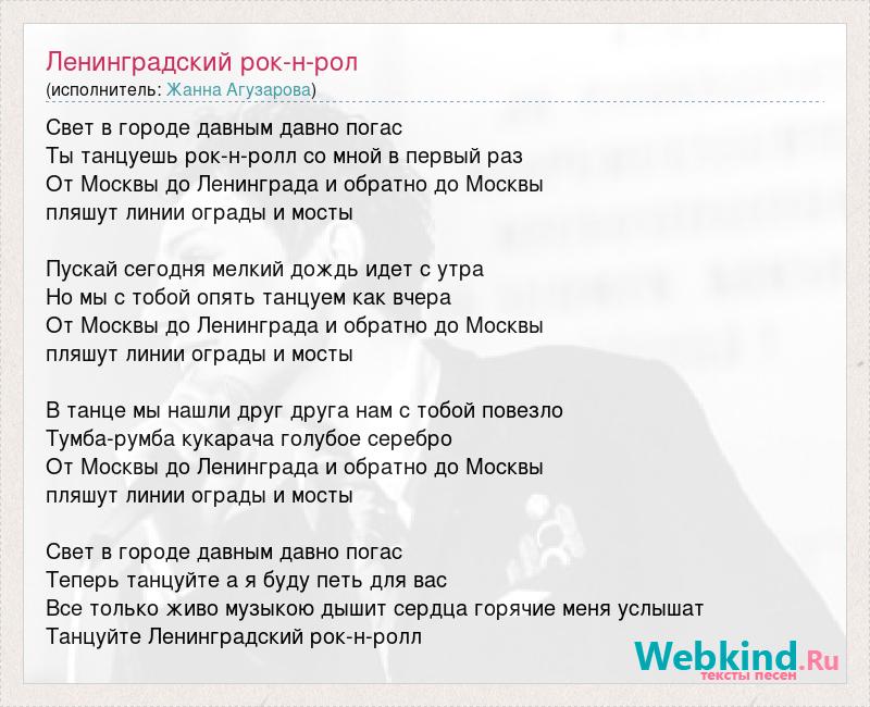Свет в городе давным давно погас Ты танцуешь рок-н-ролл со мной в первый раз От Москвы до Ленинграда и обратно до Москвы пляшут линии ограды и мосты Пускай сегодня мелкий дождь идет с утра Но мы с тобой опять танцуем как вчера От Москвы до Ленинграда и обратно до Москвы пляшут линии ограды и мосты В танце мы нашли друг друга нам с тобой повезло Тумба-румба кукарача голубое серебро От Москвы до Ленинграда и обратно до Москвы пляшут линии ограды и мосты Свет в городе давным давно погас Теперь танцуйте а я буду петь для вас Все только живо музыкою дышит сердца горячие меня услышат Танцуйте Ленинградский рок-н-ролл