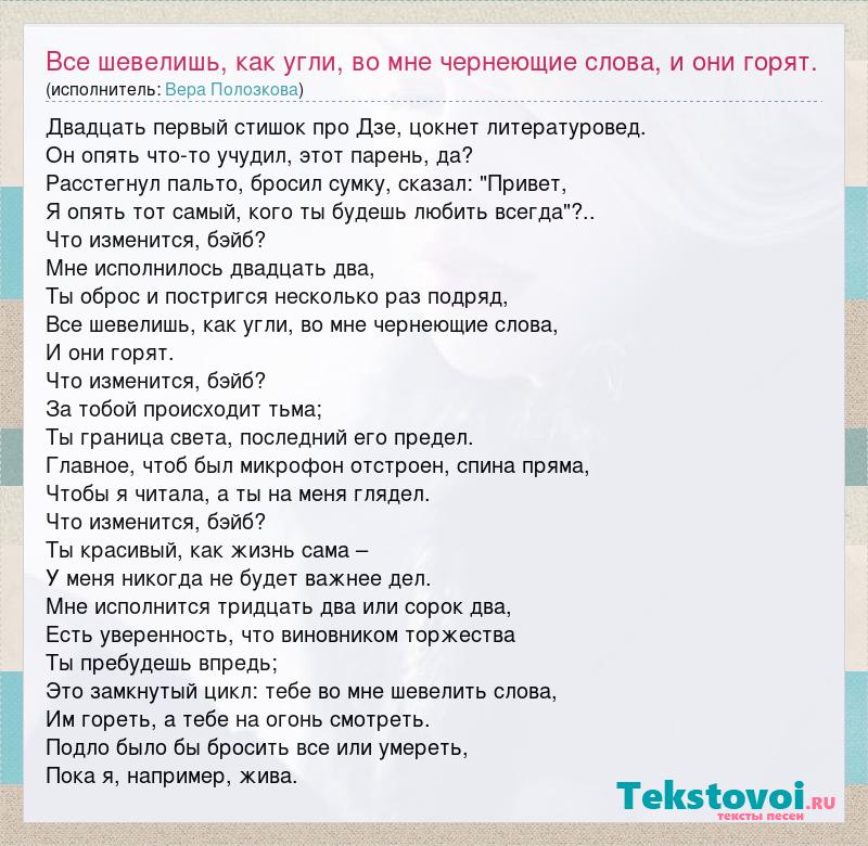 А как ты думаешь, о чем песня "Все шевелишь, как угли, во мне чернеющие слова, и они горят." ?