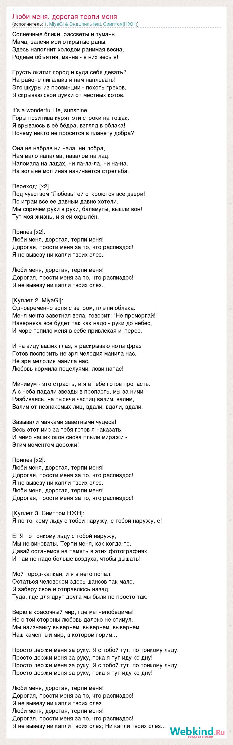 Солнечные блики, рассветы и туманы. Мама, залечи мои открытые раны. Здесь наполнит холодом ранимая весна, Родные объятия, манна - в них весь я! Грусть окатит город и куда себя девать? На районе лигалайз и нам наплевать! Это шкуры из провинции - похоть грехов, Я скрываю свои думки от местных котов. It’s a wonderful life, sunshine. Горы позитива курят эти строки на тощак. Я врываюсь в её бёдра, взгляд в облака! Почему никто не просится в планету добра? Она не набрав ни нала, ни добра, Нам мало напалма, навалом на лад. Наломала на ладах, ни ла-ла-ла, ни на-на. На волыне мол иная начинается стрельба. Переход: [х2] Под чувством "Любовь" ей откроются все двери! По играм все ее давным давно хотели. Мы спрячем руки в руки, баламуты, вышли вон! Тут моя жизнь, и я ей окрылён. Припев [х2]: Люби меня, дорогая, терпи меня! Дорогая, прости меня за то, что распиздос! Я не вывезу ни капли твоих слез. Люби меня, дорогая, терпи меня! Дорогая, прости меня за то, что распиздос! Я не вывезу ни капли твоих слез. [Куплет 2, MiyaGi]: Одновременно воля с ветром, плыли облака. Меня мечта заветная вела, говорит: "Не проморгай!" Наверняка все будет так как надо - руки до небес, И море топило меня в себе привлекая интерес. И на виду ваших глаз, я раскрываю ноты фраз Готов поспорить не зря мелодия манила нас. Не зря мелодия манила нас. Любовь кормила поцелуями, лови напас! Минимум - это страсть, и я в тебе готов пропасть. А с неба падали звезды в пропасть, мы за ними Разбиваясь, на тысячи частиц валим, валим, Валим от незнакомых лиц, вдали, вдали, вдали. Зазывали маяками заветными чудеса! Весь этот мир за тебя готов я наказать. И мимо наших окон снова плыли миражи - Этим моментом дорожи! Припев [х2]: Люби меня, дорогая, терпи меня! Дорогая, прости меня за то, что распиздос! Я не вывезу ни капли твоих слез. Люби меня, дорогая, терпи меня! Дорогая, прости меня за то, что распиздос! [Куплет 3, Симптом НЖН]: Я по тонкому льду с тобой наружу, с тобой наружу, е! Е! Я по тонкому льду с тобой наружу, Мы не виноваты. Терпи меня, как когда-то. Давай останемся на память в этих фотографиях. И нам не надо больше воздуха, чтобы дышать! Мой город-капкан, и я в него попал. Остаться человеком здесь шансов так мало. Я заберу своё и отправлюсь назад, Туда, где для друг друга мы были не просто так. Верю в красочный мир, где мы непобедимы! Но с той стороны любовь далеко не стимул. Мы наизнанку вывернем, вывернем, вывернем Наш каменный мир, в котором горим... Просто держи меня за руку. Я с тобой тут, по тонкому льду. Просто держи меня за руку, пока я тут иду ко дну! Просто держи меня за руку. Я с тобой тут, по тонкому льду. Просто держи меня за руку, пока я тут иду ко дну! Люби меня, дорогая, терпи меня! Дорогая, прости меня за то, что распиздос! Я не вывезу ни капли твоих слез. Люби меня, дорогая, терпи меня! Дорогая, прости меня за то, что распиздос! Я не вывезу ни капли твоих слез; Ни капли твоих слез...