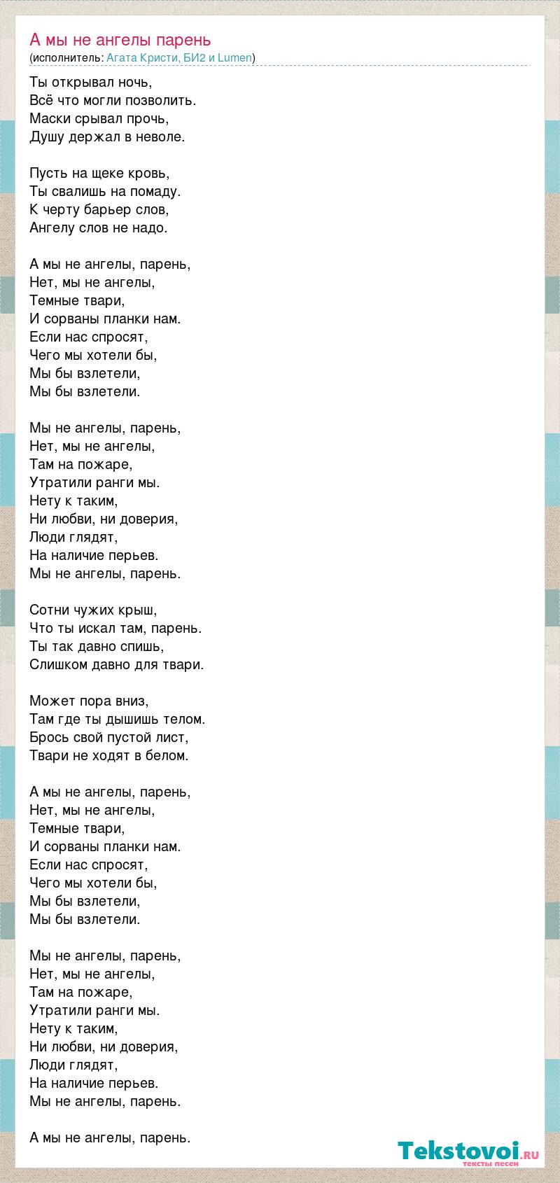 Ты открывал ночь, Всё что могли позволить. Маски срывал прочь, Душу держал в неволе. Пусть на щеке кровь, Ты свалишь на помаду. К черту барьер слов, Ангелу слов не надо. А мы не ангелы, парень, Нет, мы не ангелы, Темные твари, И сорваны планки нам. Если нас спросят, Чего мы хотели бы, Мы бы взлетели, Мы бы взлетели. Мы не ангелы, парень, Нет, мы не ангелы, Там на пожаре, Утратили ранги мы. Нету к таким, Ни любви, ни доверия, Люди глядят, На наличие перьев. Мы не ангелы, парень. Сотни чужих крыш, Что ты искал там, парень. Ты так давно спишь, Слишком давно для твари. Может пора вниз, Там где ты дышишь телом. Брось свой пустой лист, Твари не ходят в белом. А мы не ангелы, парень, Нет, мы не ангелы, Темные твари, И сорваны планки нам. Если нас спросят, Чего мы хотели бы, Мы бы взлетели, Мы бы взлетели. Мы не ангелы, парень, Нет, мы не ангелы, Там на пожаре, Утратили ранги мы. Нету к таким, Ни любви, ни доверия, Люди глядят, На наличие перьев. Мы не ангелы, парень. А мы не ангелы, парень.