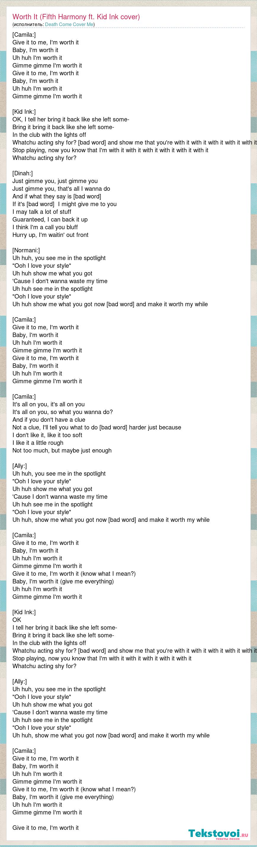 [Camila:] Give it to me, I'm worth it Baby, I'm worth it Uh huh I'm worth it Gimme gimme I'm worth it Give it to me, I'm worth it Baby, I'm worth it Uh huh I'm worth it Gimme gimme I'm worth it [Kid Ink:] OK, I tell her bring it back like she left some- Bring it bring it back like she left some- In the club with the lights off Whatchu acting shy for? [bad word] and show me that you're with it with it with it with it with it Stop playing, now you know that I'm with it with it with it with it with it with it Whatchu acting shy for? [Dinah:] Just gimme you, just gimme you Just gimme you, that's all I wanna do And if what they say is [bad word] If it's [bad word] I might give me to you I may talk a lot of stuff Guaranteed, I can back it up I think I'm a call you bluff Hurry up, I'm waitin' out front [Normani:] Uh huh, you see me in the spotlight "Ooh I love your style" Uh huh show me what you got 'Cause I don't wanna waste my time Uh huh see me in the spotlight "Ooh I love your style" Uh huh show me what you got now [bad word] and make it worth my while [Camila:] Give it to me, I'm worth it Baby, I'm worth it Uh huh I'm worth it Gimme gimme I'm worth it Give it to me, I'm worth it Baby, I'm worth it Uh huh I'm worth it Gimme gimme I'm worth it [Camila:] It's all on you, it's all on you It's all on you, so what you wanna do? And if you don't have a clue Not a clue, I'll tell you what to do [bad word] harder just because I don't like it, like it too soft I like it a little rough Not too much, but maybe just enough [Ally:] Uh huh, you see me in the spotlight "Ooh I love your style" Uh huh show me what you got 'Cause I don't wanna waste my time Uh huh see me in the spotlight "Ooh I love your style" Uh huh, show me what you got now [bad word] and make it worth my while [Camila:] Give it to me, I'm worth it Baby, I'm worth it Uh huh I'm worth it Gimme gimme I'm worth it Give it to me, I'm worth it (know what I mean?) Baby, I'm worth it (give me everything) Uh huh I'm worth it Gimme gimme I'm worth it [Kid Ink:] OK I tell her bring it back like she left some- Bring it bring it back like she left some- In the club with the lights off Whatchu acting shy for? [bad word] and show me that you're with it with it with it with it with it Stop playing, now you know that I'm with it with it with it with it with it Whatchu acting shy for? [Ally:] Uh huh, you see me in the spotlight "Ooh I love your style" Uh huh show me what you got 'Cause I don't wanna waste my time Uh huh see me in the spotlight "Ooh I love your style" Uh huh, show me what you got now [bad word] and make it worth my while [Camila:] Give it to me, I'm worth it Baby, I'm worth it Uh huh I'm worth it Gimme gimme I'm worth it Give it to me, I'm worth it (know what I mean?) Baby, I'm worth it (give me everything) Uh huh I'm worth it Gimme gimme I'm worth it Give it to me, I'm worth it