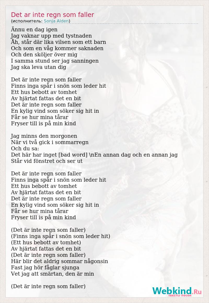 Ännu en dag igen Jag vaknar upp med tystnaden Åh, står där lika vilsen som ett barn Och som en våg kommer saknaden Och den sköljer över mig I samma stund ser jag sanningen Jag ska leva utan dig Det är inte regn som faller Finns inga spår i snön som leder hit Ett hus bebott av tomhet Av hjärtat fattas det en bit Det är inte regn som faller En kylig vind som söker sig hit in Får se hur mina tårar Fryser till is på min kind Jag minns den morgonen När vi två gick i sommarregn Och du sa: Det här har inget [bad word] \nEn annan dag och en annan jag Står vid fönstret och ser ut Det är inte regn som faller Finns inga spår i snön som leder hit Ett hus bebott av tomhet Av hjärtat fattas det en bit Det är inte regn som faller En kylig vind som söker sig hit in Får se hur mina tårar Fryser till is på min kind (Det är inte regn som faller) (Finns inga spår i snön som leder hit) (Ett hus bebott av tomhet) Av hjärtat fattas det en bit (Det är inte regn som faller) Här blir det aldrig sommar någonsin Fast jag hör fåglar sjunga Vet jag att smärtan, den är min (Det är inte regn som faller)