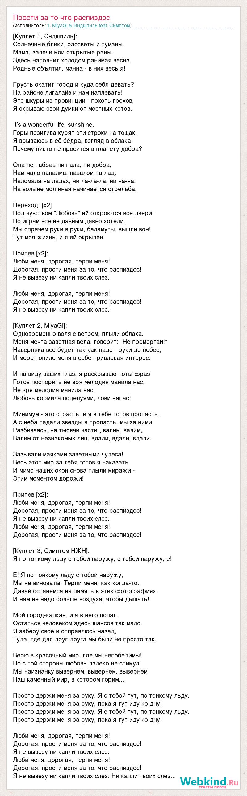 [Куплет 1, Эндшпиль]: Солнечные блики, рассветы и туманы. Мама, залечи мои открытые раны. Здесь наполнит холодом ранимая весна, Родные объятия, манна - в них весь я! Грусть окатит город и куда себя девать? На районе лигалайз и нам наплевать! Это шкуры из провинции - похоть грехов, Я скрываю свои думки от местных котов. It’s a wonderful life, sunshine. Горы позитива курят эти строки на тощак. Я врываюсь в её бёдра, взгляд в облака! Почему никто не просится в планету добра? Она не набрав ни нала, ни добра, Нам мало напалма, навалом на лад. Наломала на ладах, ни ла-ла-ла, ни на-на. На волыне мол иная начинается стрельба. Переход: [х2] Под чувством "Любовь" ей откроются все двери! По играм все ее давным давно хотели. Мы спрячем руки в руки, баламуты, вышли вон! Тут моя жизнь, и я ей окрылён. Припев [х2]: Люби меня, дорогая, терпи меня! Дорогая, прости меня за то, что распиздос! Я не вывезу ни капли твоих слез. Люби меня, дорогая, терпи меня! Дорогая, прости меня за то, что распиздос! Я не вывезу ни капли твоих слез. [Куплет 2, MiyaGi]: Одновременно воля с ветром, плыли облака. Меня мечта заветная вела, говорит: "Не проморгай!" Наверняка все будет так как надо - руки до небес, И море топило меня в себе привлекая интерес. И на виду ваших глаз, я раскрываю ноты фраз Готов поспорить не зря мелодия манила нас. Не зря мелодия манила нас. Любовь кормила поцелуями, лови напас! Минимум - это страсть, и я в тебе готов пропасть. А с неба падали звезды в пропасть, мы за ними Разбиваясь, на тысячи частиц валим, валим, Валим от незнакомых лиц, вдали, вдали, вдали. Зазывали маяками заветными чудеса! Весь этот мир за тебя готов я наказать. И мимо наших окон снова плыли миражи - Этим моментом дорожи! Припев [х2]: Люби меня, дорогая, терпи меня! Дорогая, прости меня за то, что распиздос! Я не вывезу ни капли твоих слез. Люби меня, дорогая, терпи меня! Дорогая, прости меня за то, что распиздос! [Куплет 3, Симптом НЖН]: Я по тонкому льду с тобой наружу, с тобой наружу, е! Е! Я по тонкому льду с тобой наружу, Мы не виноваты. Терпи меня, как когда-то. Давай останемся на память в этих фотографиях. И нам не надо больше воздуха, чтобы дышать! Мой город-капкан, и я в него попал. Остаться человеком здесь шансов так мало. Я заберу своё и отправлюсь назад, Туда, где для друг друга мы были не просто так. Верю в красочный мир, где мы непобедимы! Но с той стороны любовь далеко не стимул. Мы наизнанку вывернем, вывернем, вывернем Наш каменный мир, в котором горим... Просто держи меня за руку. Я с тобой тут, по тонкому льду. Просто держи меня за руку, пока я тут иду ко дну! Просто держи меня за руку. Я с тобой тут, по тонкому льду. Просто держи меня за руку, пока я тут иду ко дну! Люби меня, дорогая, терпи меня! Дорогая, прости меня за то, что распиздос! Я не вывезу ни капли твоих слез. Люби меня, дорогая, терпи меня! Дорогая, прости меня за то, что распиздос! Я не вывезу ни капли твоих слез; Ни капли твоих слез...