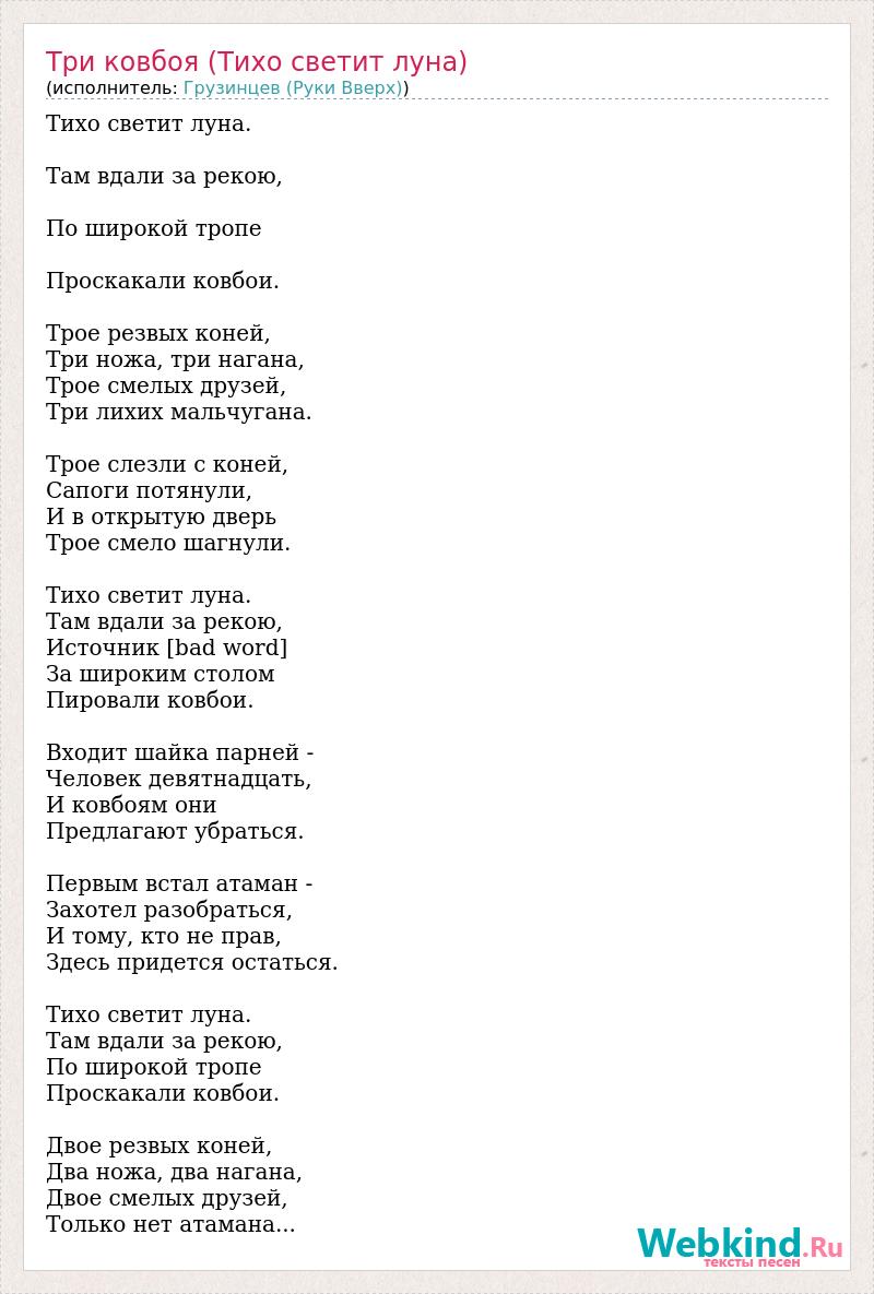 Тихо светит луна. Там вдали за рекою, По широкой тропе Проскакали ковбои. Трое резвых коней, Три ножа, три нагана, Трое смелых друзей, Три лихих мальчугана. Трое слезли с коней, Сапоги потянули, И в открытую дверь Трое смело шагнули. Тихо светит луна. Там вдали за рекою, Источник [bad word] За широким столом Пировали ковбои. Входит шайка парней - Человек девятнадцать, И ковбоям они Предлагают убраться. Первым встал атаман - Захотел разобраться, И тому, кто не прав, Здесь придeтся остаться. Тихо светит луна. Там вдали за рекою, По широкой тропе Проскакали ковбои. Двое резвых коней, Два ножа, два нагана, Двое смелых друзей, Только нет атамана...