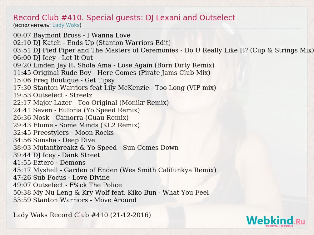 А как ты думаешь, о чем песня "Record Club #410. Special guests: DJ Lexani and Outselect" ?