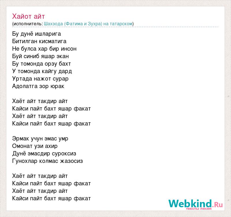 Бу дунё ишларига Битилган кисматига Не булса хар бир инсон Буй синиб яшар экан Бу томонда орзу бахт У томонда кайгу дард Уртада нажот сурар Адолатга зор юрак Хаёт айт такдир айт Кайси пайт бахт яшар факат Хаёт айт такдир айт Кайси пайт бахт яшар факат Эрмак учун эмас умр Омонат узи ахир Дунё эмасдир суроксиз Гунохлар колмас жазосиз Хаёт айт такдир айт Кайси пайт бахт яшар факат Хаёт айт такдир айт Кайси пайт бахт яшар факат