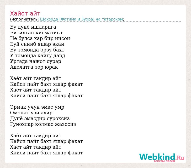 Бу дунё ишларига Битилган кисматига Не булса хар бир инсон Буй синиб яшар экан Бу томонда орзу бахт У томонда кайгу дард Уртада нажот сурар Адолатга зор юрак Хаёт айт такдир айт Кайси пайт бахт яшар факат Хаёт айт такдир айт Кайси пайт бахт яшар факат Эрмак учун эмас умр Омонат узи ахир Дунё эмасдир суроксиз Гунохлар колмас жазосиз Хаёт айт такдир айт Кайси пайт бахт яшар факат Хаёт айт такдир айт Кайси пайт бахт яшар факат