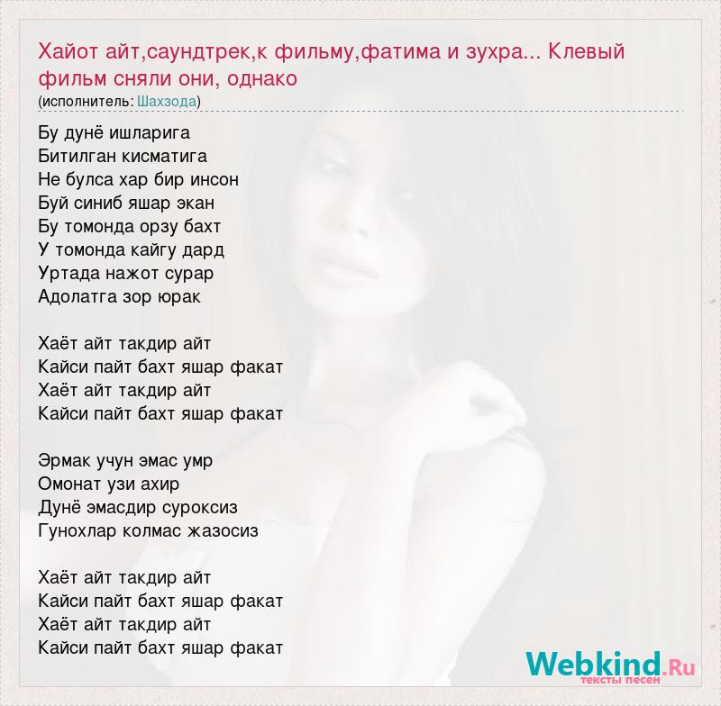 Главная→Исполнители→Шахзода→Хайот айт,саундтрек,к фильму,фатима и зухра... Клевый фильм сняли они, однако