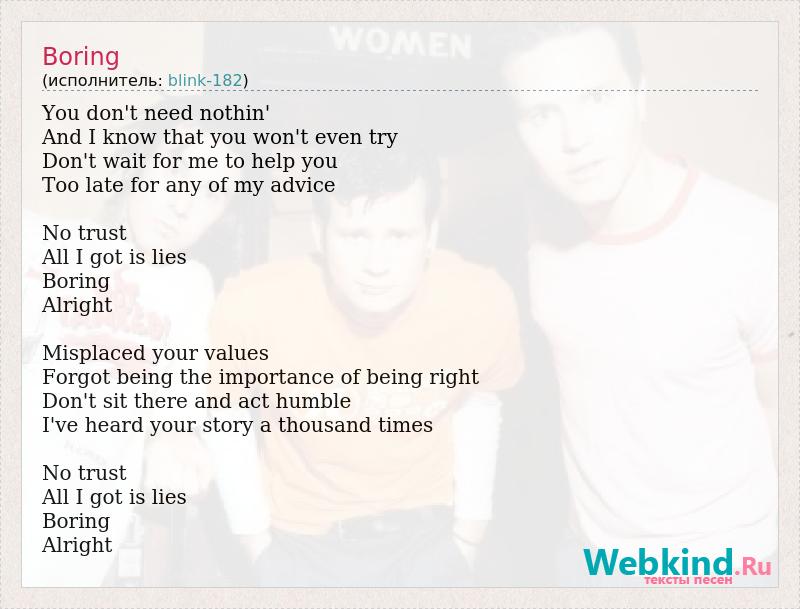 You don't need nothin' And I know that you won't even try Don't wait for me to help you Too late for any of my advice No trust All I got is lies Boring Alright Misplaced your values Forgot being the importance of being right Don't sit there and act humble I've heard your story a thousand times No trust All I got is lies Boring Alright
