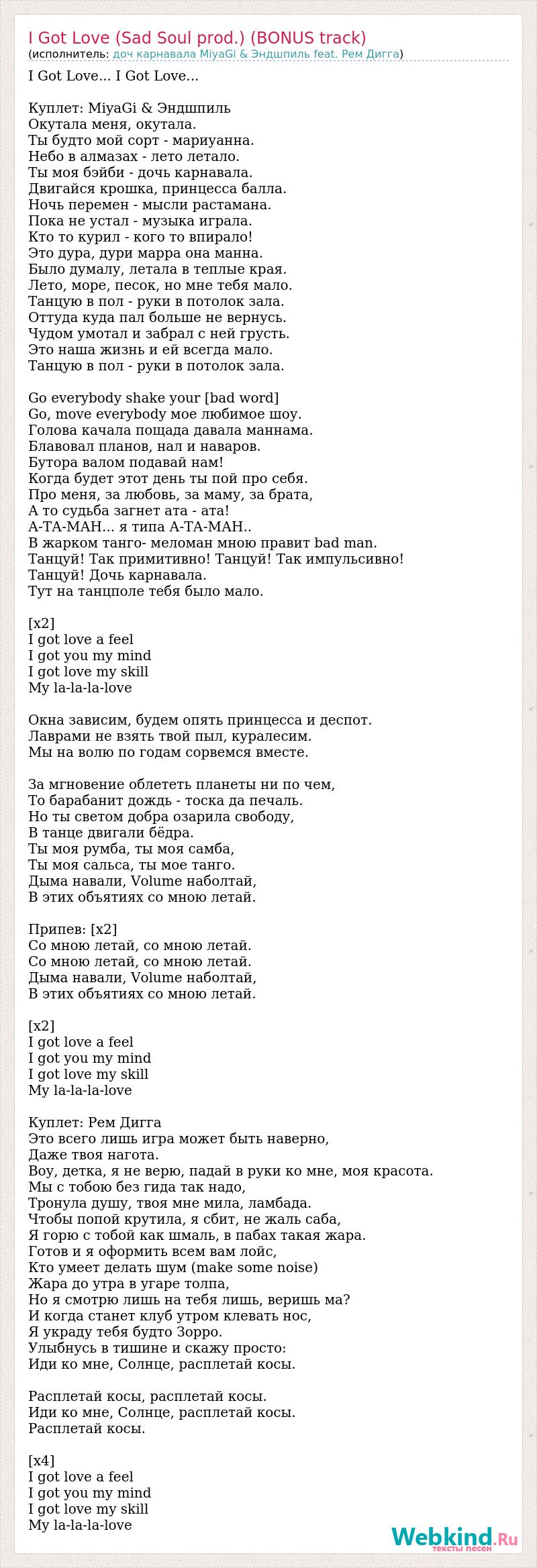 I Got Love... I Got Love... Куплет: MiyaGi & Эндшпиль Окутала меня, окутала. Ты будто мой сорт - мариуанна. Небо в алмазах - лето летало. Ты моя бэйби - дочь карнавала. Двигайся крошка, принцесса балла. Ночь перемен - мысли растамана. Пока не устал - музыка играла. Кто то курил - кого то впирало! Это дура, дури марра она манна. Было думалу, летала в теплые края. Лето, море, песок, но мне тебя мало. Танцую в пол - руки в потолок зала. Оттуда куда пал больше не вернусь. Чудом умотал и забрал с ней грусть. Это наша жизнь и ей всегда мало. Танцую в пол - руки в потолок зала. Go everybody shake your [bad word] Go, move everybody мое любимое шоу. Голова качала пощада давала маннама. Блавовал планов, нал и наваров. Бутора валом подавай нам! Когда будет этот день ты пой про себя. Про меня, за любовь, за маму, за брата, А то судьба загнет ата - ата! А-ТА-МАН... я типа А-ТА-МАН.. В жарком танго- меломан мною правит bad man. Танцуй! Так примитивно! Танцуй! Так импульсивно! Танцуй! Дочь карнавала. Тут на танцполе тебя было мало. [x2] I got love a feel I got you my mind I got love my skill My la-la-la-love Окна зависим, будем опять принцесса и деспот. Лаврами не взять твой пыл, куралесим. Мы на волю по годам сорвемся вместе. За мгновение облететь планеты ни по чем, То барабанит дождь - тоска да печаль. Но ты светом добра озарила свободу, В танце двигали бёдра. Ты моя румба, ты моя самба, Ты моя сальса, ты мое танго. Дыма навали, Volume наболтай, В этих объятиях со мною летай. Припев: [х2] Со мною летай, со мною летай. Со мною летай, со мною летай. Дыма навали, Volume наболтай, В этих объятиях со мною летай. [х2] I got love a feel I got you my mind I got love my skill My la-la-la-love Куплет: Рем Дигга Это всего лишь игра может быть наверно, Даже твоя нагота. Воу, детка, я не верю, падай в руки ко мне, моя красота. Мы с тобою без гида так надо, Тронула душу, твоя мне мила, ламбада. Чтобы попой крутила, я сбит, не жаль саба, Я горю с тобой как шмаль, в пабах такая жара. Готов и я оформить всем вам лойс, Кто умеет делать шум (make some noise) Жара до утра в угаре толпа, Но я смотрю лишь на тебя лишь, веришь ма? И когда станет клуб утром клевать нос, Я украду тебя будто Зорро. Улыбнусь в тишине и скажу просто: Иди ко мне, Солнце, расплетай косы. Расплетай косы, расплетай косы. Иди ко мне, Солнце, расплетай косы. Расплетай косы. [x4] I got love a feel I got you my mind I got love my skill My la-la-la-love