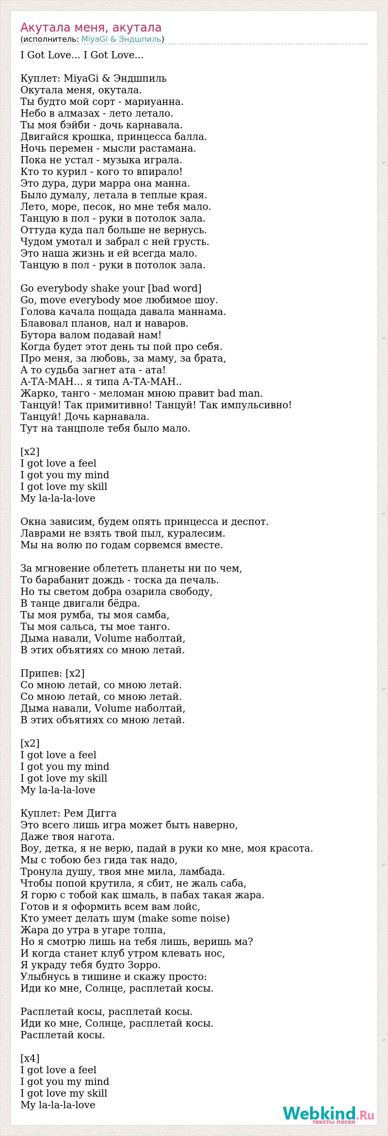 I Got Love... I Got Love... Куплет: MiyaGi & Эндшпиль Окутала меня, окутала. Ты будто мой сорт - мариуанна. Небо в алмазах - лето летало. Ты моя бэйби - дочь карнавала. Двигайся крошка, принцесса балла. Ночь перемен - мысли растамана. Пока не устал - музыка играла. Кто то курил - кого то впирало! Это дура, дури марра она манна. Было думалу, летала в теплые края. Лето, море, песок, но мне тебя мало. Танцую в пол - руки в потолок зала. Оттуда куда пал больше не вернусь. Чудом умотал и забрал с ней грусть. Это наша жизнь и ей всегда мало. Танцую в пол - руки в потолок зала. Go everybody shake your [bad word] Go, move everybody мое любимое шоу. Голова качала пощада давала маннама. Блавовал планов, нал и наваров. Бутора валом подавай нам! Когда будет этот день ты пой про себя. Про меня, за любовь, за маму, за брата, А то судьба загнет ата - ата! А-ТА-МАН... я типа А-ТА-МАН.. Жарко, танго - меломан мною правит bad man. Танцуй! Так примитивно! Танцуй! Так импульсивно! Танцуй! Дочь карнавала. Тут на танцполе тебя было мало. [x2] I got love a feel I got you my mind I got love my skill My la-la-la-love Окна зависим, будем опять принцесса и деспот. Лаврами не взять твой пыл, куралесим. Мы на волю по годам сорвемся вместе. За мгновение облететь планеты ни по чем, То барабанит дождь - тоска да печаль. Но ты светом добра озарила свободу, В танце двигали бёдра. Ты моя румба, ты моя самба, Ты моя сальса, ты мое танго. Дыма навали, Volume наболтай, В этих объятиях со мною летай. Припев: [х2] Со мною летай, со мною летай. Со мною летай, со мною летай. Дыма навали, Volume наболтай, В этих объятиях со мною летай. [х2] I got love a feel I got you my mind I got love my skill My la-la-la-love Куплет: Рем Дигга Это всего лишь игра может быть наверно, Даже твоя нагота. Воу, детка, я не верю, падай в руки ко мне, моя красота. Мы с тобою без гида так надо, Тронула душу, твоя мне мила, ламбада. Чтобы попой крутила, я сбит, не жаль саба, Я горю с тобой как шмаль, в пабах такая жара. Готов и я оформить всем вам лойс, Кто умеет делать шум (make some noise) Жара до утра в угаре толпа, Но я смотрю лишь на тебя лишь, веришь ма? И когда станет клуб утром клевать нос, Я украду тебя будто Зорро. Улыбнусь в тишине и скажу просто: Иди ко мне, Солнце, расплетай косы. Расплетай косы, расплетай косы. Иди ко мне, Солнце, расплетай косы. Расплетай косы. [x4] I got love a feel I got you my mind I got love my skill My la-la-la-love
