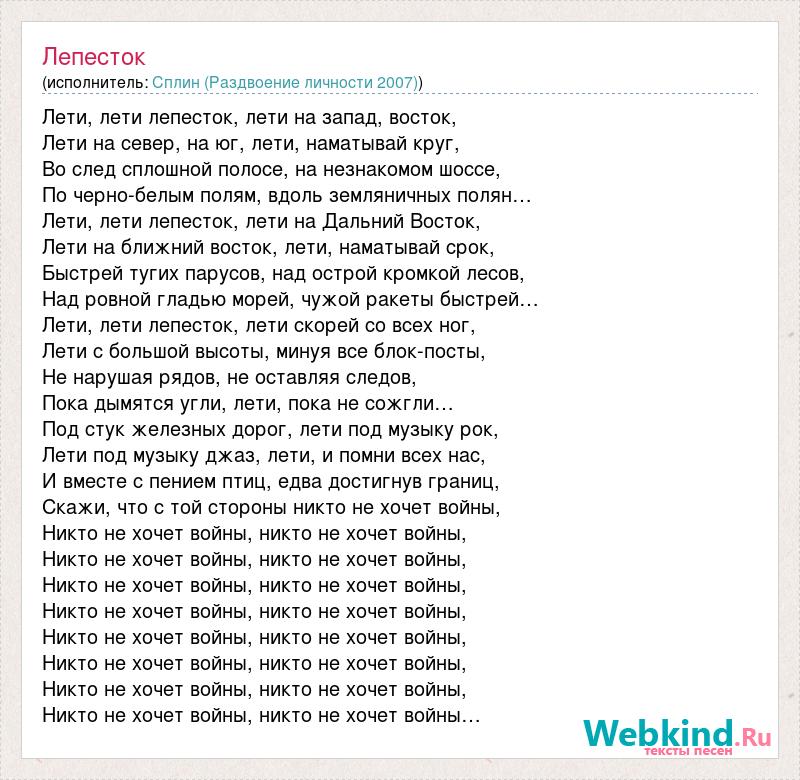 Лети, лети лепесток, лети на запад, восток, Лети на север, на юг, лети, наматывай круг, Во след сплошной полосе, на незнакомом шоссе, По черно-белым полям, вдоль земляничных полян… Лети, лети лепесток, лети на Дальний Восток, Лети на ближний восток, лети, наматывай срок, Быстрей тугих парусов, над острой кромкой лесов, Над ровной гладью морей, чужой ракеты быстрей… Лети, лети лепесток, лети скорей со всех ног, Лети с большой высоты, минуя все блок-посты, Не нарушая рядов, не оставляя следов, Пока дымятся угли, лети, пока не сожгли… Под стук железных дорог, лети под музыку рок, Лети под музыку джаз, лети, и помни всех нас, И вместе с пением птиц, едва достигнув границ, Скажи, что с той стороны никто не хочет войны, Никто не хочет войны, никто не хочет войны, Никто не хочет войны, никто не хочет войны, Никто не хочет войны, никто не хочет войны, Никто не хочет войны, никто не хочет войны, Никто не хочет войны, никто не хочет войны, Никто не хочет войны, никто не хочет войны, Никто не хочет войны, никто не хочет войны, Никто не хочет войны, никто не хочет войны…