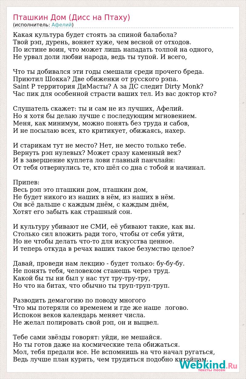 Какая культура будет стоять за спиной балабола? Твой рэп, дурень, воняет хуже, чем весной от отходов. По истине воин, что может лишь нападать толпой на одного, Не урвал доли любви народа, ведь ты тупой. И всего, Что ты добивался эти годы смешали среди прочего бреда. Приютил Шокка? Две обиженки от русского рэпа. Saint P территория ДиМасты? А за ДС следит Dirty Monk? Час пик для особенной страсти ваших тел. Из вас доктор кто? Слушатель скажет: ты и сам не из лучших, Афелий. Но я хотя бы делаю лучше с последующим мгновением. Меня, как минимум, можно понять без труда и сабов, И не посылаю всех, кто критикует, обижаясь, нахер. И старикам тут не место? Нет, не место только тебе. Вернуть рэп нулевых? Может сразу каменный век? И в завершение куплета лови главный панчлайн: От тебя отвернулись те, кто шёл со дна с тобой и начинал. Припев: Весь рэп это пташкин дом, пташкин дом, Не будет никого из наших в нём, из наших в нём. Он всё дальше с каждым днём, с каждым днём, Хотят его забыть как страшный сон. И культуру убивают не СМИ, её убивают такие, как вы. Столько сил вложить ради того, чтобы от себя уйти, Но не чтобы делать что-то для искусства ценное. И теперь откуда в речах ваших такое безумство целое? Давай, проведи нам лекцию - будет только: бу-бу-бу. Не понять тебя, человеком станешь через труд. Какой бы ты ни был у нас тут тру-тру-тру, Но что на битах, что обычно ты труп-труп-труп. Разводить демагогию по поводу многого Что мы потеряли со временем и где же наше логово. Испокон веков календарь меняет числа. Не желал полировать свой рэп, он и выцвел. Тебе сами звёзды говорят: уйди, не мешайся. Но ты готов даже на космические тела обижаться. Мол, тебя предали все. Не вспомнишь на что начал ругаться, Ведь лучше план курить, чем трудиться подобно китайцам.
