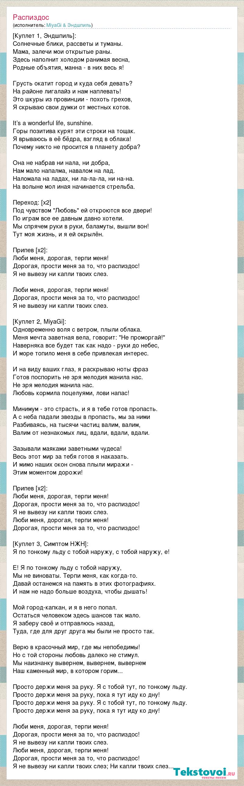 [Куплет 1, Эндшпиль]: Солнечные блики, рассветы и туманы. Мама, залечи мои открытые раны. Здесь наполнит холодом ранимая весна, Родные объятия, манна - в них весь я! Грусть окатит город и куда себя девать? На районе лигалайз и нам наплевать! Это шкуры из провинции - похоть грехов, Я скрываю свои думки от местных котов. It’s a wonderful life, sunshine. Горы позитива курят эти строки на тощак. Я врываюсь в её бёдра, взгляд в облака! Почему никто не просится в планету добра? Она не набрав ни нала, ни добра, Нам мало напалма, навалом на лад. Наломала на ладах, ни ла-ла-ла, ни на-на. На волыне мол иная начинается стрельба. Переход: [х2] Под чувством "Любовь" ей откроются все двери! По играм все ее давным давно хотели. Мы спрячем руки в руки, баламуты, вышли вон! Тут моя жизнь, и я ей окрылён. Припев [х2]: Люби меня, дорогая, терпи меня! Дорогая, прости меня за то, что распиздос! Я не вывезу ни капли твоих слез. Люби меня, дорогая, терпи меня! Дорогая, прости меня за то, что распиздос! Я не вывезу ни капли твоих слез. [Куплет 2, MiyaGi]: Одновременно воля с ветром, плыли облака. Меня мечта заветная вела, говорит: "Не проморгай!" Наверняка все будет так как надо - руки до небес, И море топило меня в себе привлекая интерес. И на виду ваших глаз, я раскрываю ноты фраз Готов поспорить не зря мелодия манила нас. Не зря мелодия манила нас. Любовь кормила поцелуями, лови напас! Минимум - это страсть, и я в тебе готов пропасть. А с неба падали звезды в пропасть, мы за ними Разбиваясь, на тысячи частиц валим, валим, Валим от незнакомых лиц, вдали, вдали, вдали. Зазывали маяками заветными чудеса! Весь этот мир за тебя готов я наказать. И мимо наших окон снова плыли миражи - Этим моментом дорожи! Припев [х2]: Люби меня, дорогая, терпи меня! Дорогая, прости меня за то, что распиздос! Я не вывезу ни капли твоих слез. Люби меня, дорогая, терпи меня! Дорогая, прости меня за то, что распиздос! [Куплет 3, Симптом НЖН]: Я по тонкому льду с тобой наружу, с тобой наружу, е! Е! Я по тонкому льду с тобой наружу, Мы не виноваты. Терпи меня, как когда-то. Давай останемся на память в этих фотографиях. И нам не надо больше воздуха, чтобы дышать! Мой город-капкан, и я в него попал. Остаться человеком здесь шансов так мало. Я заберу своё и отправлюсь назад, Туда, где для друг друга мы были не просто так. Верю в красочный мир, где мы непобедимы! Но с той стороны любовь далеко не стимул. Мы наизнанку вывернем, вывернем, вывернем Наш каменный мир, в котором горим... Просто держи меня за руку. Я с тобой тут, по тонкому льду. Просто держи меня за руку, пока я тут иду ко дну! Просто держи меня за руку. Я с тобой тут, по тонкому льду. Просто держи меня за руку, пока я тут иду ко дну! Люби меня, дорогая, терпи меня! Дорогая, прости меня за то, что распиздос! Я не вывезу ни капли твоих слез. Люби меня, дорогая, терпи меня! Дорогая, прости меня за то, что распиздос! Я не вывезу ни капли твоих слез; Ни капли твоих слез...